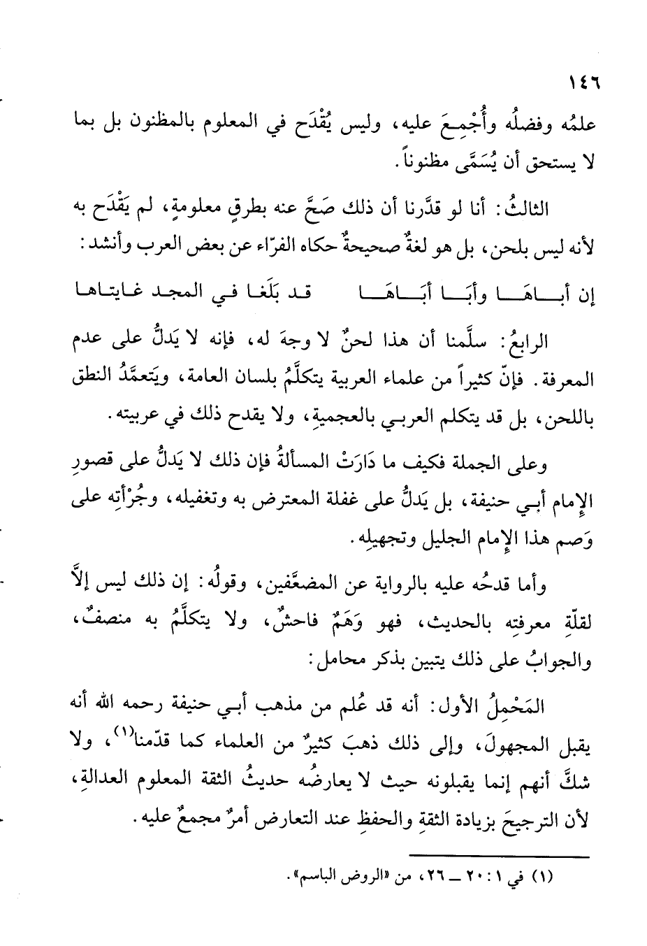 وعلى الجملة؛ فكيف ما دارت المسألة فإن ذلك لا يدل على قصور الإمام أبي حنيفة, بل يدل على غفلة المعترض به وتغفيله, وجرأته على وصم هذا الإمام الجليل وتجهيله.