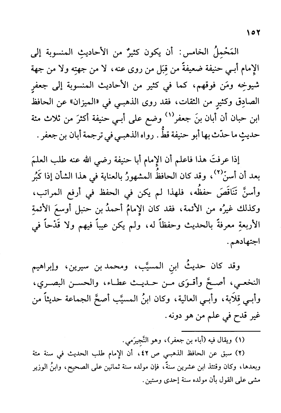 المحمل الخامس: أن يكون كثيرٌ من الأحاديث المنسوبة إلى الإمام أبي حنيفة ضعيفة من قبيل ما روي عنه, لا من جهته, ولا من جهة شيوخه ومن فوقهم, كما في كثير من الأحاديث المنسوبة إلى جعفر الصادق, وكثير من الثقات، فقد روى الذهبي في " الميزان " عن الحافظ ابن حبان: «أَنَّ أَبَانَ بْنَ جَعْفَرٍ (¬1) وَضَعَ عَلَى أَبِي حَنِيفَةَ أَكْثَرَ مِنْ ثَلاَثِمِائَةِ حَدِيثٍ, مَا حَدَّثَ بِهَا أَبُو حَنِيفَةَ قَطُّ» , رواه الذهبي في ترجمة أبان بن جعفر.