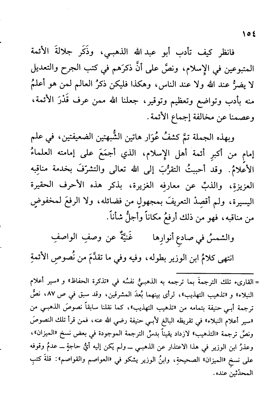 = القارئ الترجمة بما ترجمه به الذهبي نفسه في " تذكرة الحفاظ " و" سير أعلام النبلاء "، و" تهذيب التهذيب " لرأى بينهما بُعْدَ المشرقين، وقد سبق في ص 87، نص ترجمة أبي حنيفة بتمامه من " تهذيب التهذيب "، كما نقلنا سابقًا نصوص الذهبي من " سير أعلام النبلاء " في تقريظه البالغ لأبي حنيفة - رَضِيَ اللهُ عَنْهُ -، فمن قرأ تلك النصوص ونص ترجمة " التذهيب " لازداد يقينًا بدس الترجمة الموجودة في بعض نسخ " الميزان "، وعذر ابن الوزير في هذا الاعتذار عن الذهبي - ولم يكن إليه أي حاجة - عدم وقوفه على نسخ " الميزان " الصحيحة، وابن الوزير يشكو في " العواصم والقواصم ": قلة كتب المحدثين عنده.
