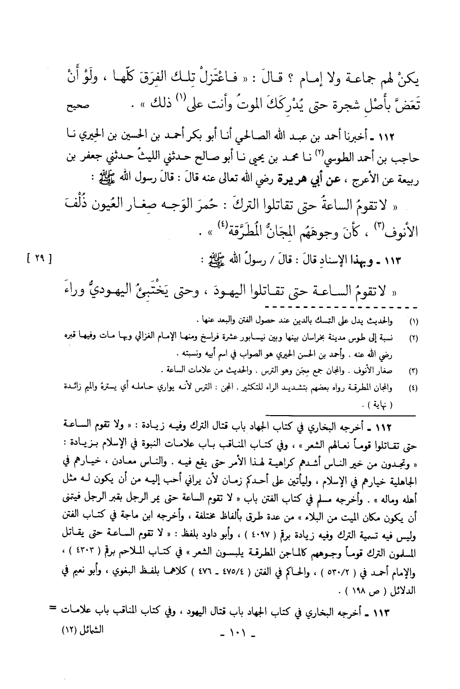 112 - أَخْبَرَنَا أَحْمَدُ بْنُ عَبْدِ اللَّهِ الصَّالِحِيُّ أَنَا أَبُو بَكْرٍ أَحْمَدُ بْنُ الْحُسَيْنِ بن الْحِيرِيِّ نا حَاجِبُ بْنُ أَحْمَدَ الطُّوسِيُّ نا مُحَمَّدُ بْنُ يَحْيَى نا أَبُو صَالِحٍ حَدَّثَنِي اللَّيْثُ حَدَّثَنِي جَعْفَرُ بْنُ رَبِيعَةَ عَنِ الأَعْرَجِ عَنْ أَبِي هُرَيْرَةَ رَضِيَ اللَّهُ تَعَالَى عَنْهُ قَالَ قَالَ رَسُولُ اللَّهِ صَلَّى اللهُ عَلَيْهِ وَسَلَّمَ لا تَقُومُ السَّاعَةُ حَتَّى تُقَاتِلُوا التُّرْكَ حُمْرَ الْوَجْهِ صِغَارَ الْعُيُونِ ذُلْفَ الأنوف كأن وجوههم الْمَجَانُّ الْمُطْرَقَةُ.