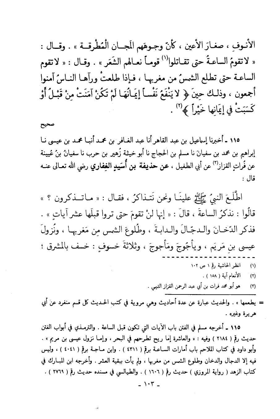 115 - أَخْبَرَنَا إِسْمَاعِيلُ بْنُ عَبْدِ الْقَاهِرِ أَنَا عَبْدُ الْغَافِرِ بْنُ مُحَمَّدٍ أَنْبَا مُحَمَّدُ بْنُ عِيسَى نا إِبْرَاهِيمُ بْنُ مُحَمَّدِ بْنِ سُفْيَانَ نا مُسْلِمُ بْنُ الْحَجَّاجِ نا أَبُو خَيْثَمَةَ زُهَيْرُ بْنُ حَرْبٍ نا سُفْيَانُ بْنُ عُيَيْنَةَ عَنْ فُرَاتٍ الْقَزَّازِ عَنْ أَبِي الطُّفَيْلِ عَنْ حُذَيْفَةَ بْنِ أُسَيْدٍ الْغِفَارِيِّ رَضِيَ اللَّهُ تَعَالَى عَنْهُ قَالَ اطَّلَعَ النَّبِيُّ صَلَّى اللهُ عَلَيْهِ وَسَلَّمَ عَلَيْنَا وَنَحْنُ نَتَذَاكَرُ فَقَالَ مَا تَذْكُرُونَ قَالُوا نَذْكُرُ السَّاعَةَ قَالَ إِنَّهَا لَنْ تَقُومَ حَتَّى تَرَوْا قَبْلَهَا عَشْرَ آيَاتٍ فَذَكَرَ الدُّخَانَ وَالدَّجَالَ وَالدَّابَةَ وَطُلُوعَ الشَّمْسِ مِنْ مَغْرِبِهَا وَنُزُولَ عِيسَى بن مَرْيَمَ وَيَأْجُوجَ وَمَأْجُوجَ وَثَلاثَةَ خُسُوفٍ خَسْفٌ بِالْمَشْرِقِ: