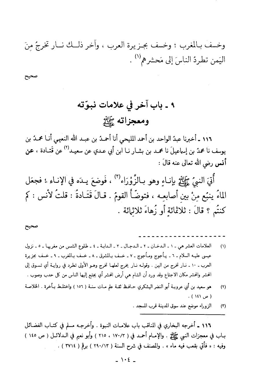 116 - أَخْبَرَنَا عَبْدُ الواحد بن أحمد الْمَلِيحِيُّ أَنَا أَحْمَدُ بْنُ عَبْدِ اللَّهِ النُّعَيْمِيُّ أَنَا مُحَمَّدُ بْنُ يُوسُفَ نا مُحَمَّدُ بْنُ إِسْمَاعِيلَ نا مُحَمَّدُ بْنُ بَشَّارٍ نا ابْنُ أَبِي عَدِيٍّ عَنْ سَعِيدٍ عَنْ قَتَادَةَ عَنْ أَنَسٍ رَضِيَ اللَّهُ تَعَالَى عَنْهُ قَالَ أُتِيَ النَّبِيُّ صَلَّى اللهُ عَلَيْهِ وَسَلَّمَ بِإِنَاءٍ وَهُوَ بِالزَّوْرَاءِ فَوَضَعَ يَدَهُ فِي الإِنَاءِ فَجَعَلَ الْمَاءُ يَنْبُعُ مِنْ بَيْنِ أَصَابِعِهِ فَتَوَضَّأَ الْقَوْمُ قَالَ قَتَادَةَ قُلْتُ لأَنَسٍ كَمْ كنتم قال ثلاثمائة أو زهاء ثلاثمائة. صحيح