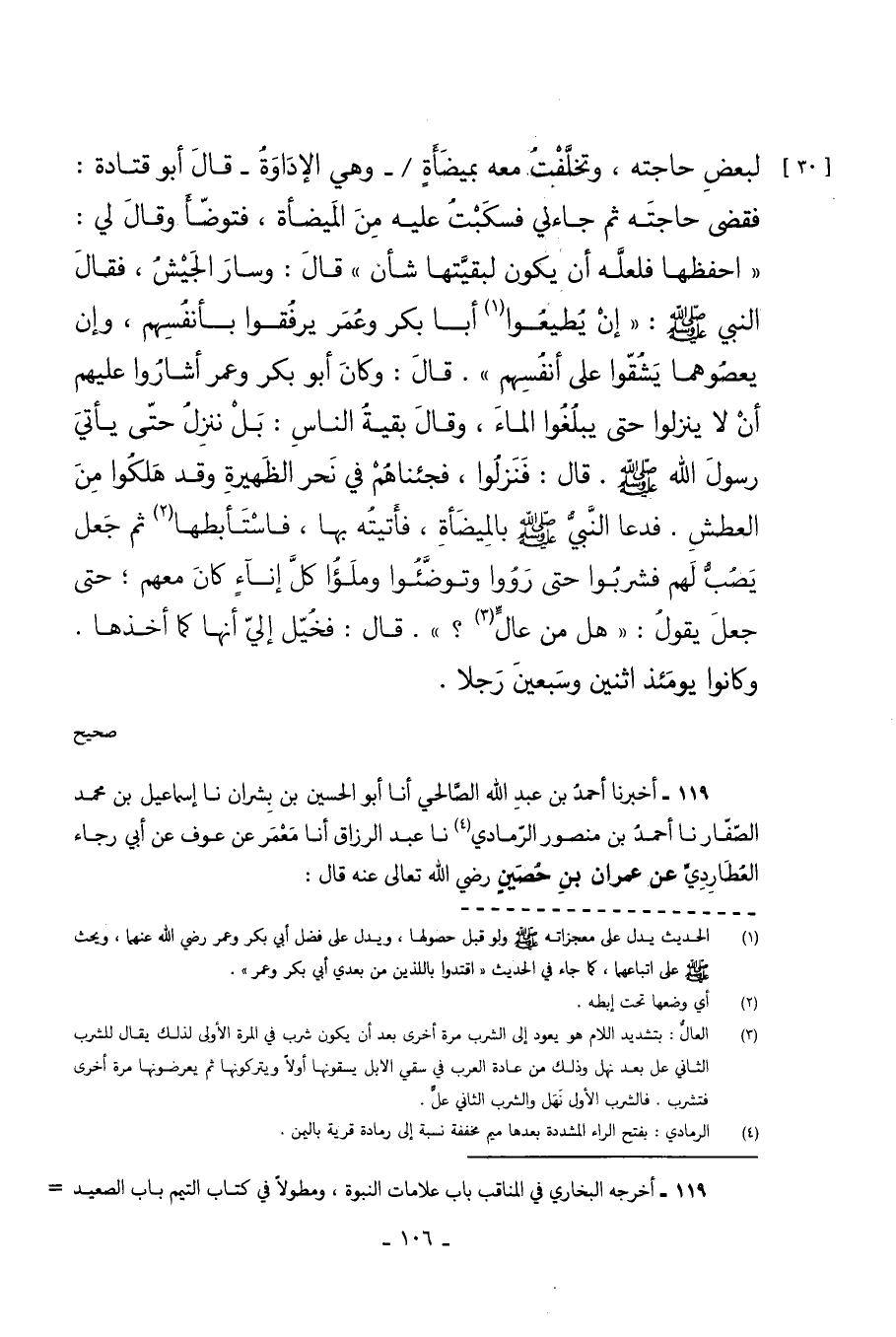 لِبَعْضِ حَاجَتِهِ وَتَخَلَّفْتُ مَعَهُ بِمَيْضَأَةٍ وَهِيَ الإِدَاوَةُ قَالَ أَبُو قَتَادَةَ فَقَضَى حَاجَتَهُ ثُمَّ جَاءَنِي فَسَكَبْتُ عَلَيْهِ مِنَ الْمَيْضَأَةِ فَتَوَضَّأَ وَقَالَ لِي احْفَظْهَا فَلَعَلَّهُ أَنْ يَكُونَ لِبَقِيَّتِهَا شَأْنٌ قَالَ وَسَارَ الْجَيْشُ فَقَالَ النَّبِيُّ صَلَّى اللهُ عَلَيْهِ وَسَلَّمَ إِنْ يُطِيعُوا أَبَا بَكْرٍ وَعُمَرَ يَرْفُقُوا بِأَنْفُسِهِمْ وَإِنْ يَعْصُوهُمَا يَشُقُّوا عَلَى أَنْفُسِهِمْ قَالَ وَكَانَ أَبُو بَكْرٍ وَعُمَرُ أَشَارُوا عَلَيْهِمْ أَنْ لا يَنْزِلُوا حَتَّى يَبْلُغُوا الْمَاءَ وَقَالَ بَقِيَّةُ النَّاسِ بَلْ نَنْزِلُ حَتَّى يَأْتِيَ رَسُولُ اللَّهِ صَلَّى اللهُ عَلَيْهِ وَسَلَّمَ قَالَ فَنَزَلُوا فَجِئْنَاهُمْ فِي نَحْرِ الظَّهِيرَةِ وَقَدْ هَلَكُوا مِنَ الْعَطَشِ فَدَعَا النَّبِيُّ صَلَّى اللهُ عَلَيْهِ وَسَلَّمَ بِالْمَيْضَأَةِ فَأَتَيْتُهُ بِهَا فَاسْتَأْبَطَهَا ثُمَّ جَعَلَ يَصُبُّ لَهُمْ فَشَرِبُوا حَتَّى رووا وتوضئوا وملؤا كُلَّ إِنَاءٍ كَانَ مَعَهُمْ حَتَّى جَعَلَ يَقُولُ هَلْ مِنْ عَالٍّ قَالَ فَخُيِّلَ إِلَيَّ أَنَّهَا كَمَا أَخَذَهَا وَكَانُوا يَوْمَئِذٍ اثْنَيْنِ وسبعين رجلا. صحيح