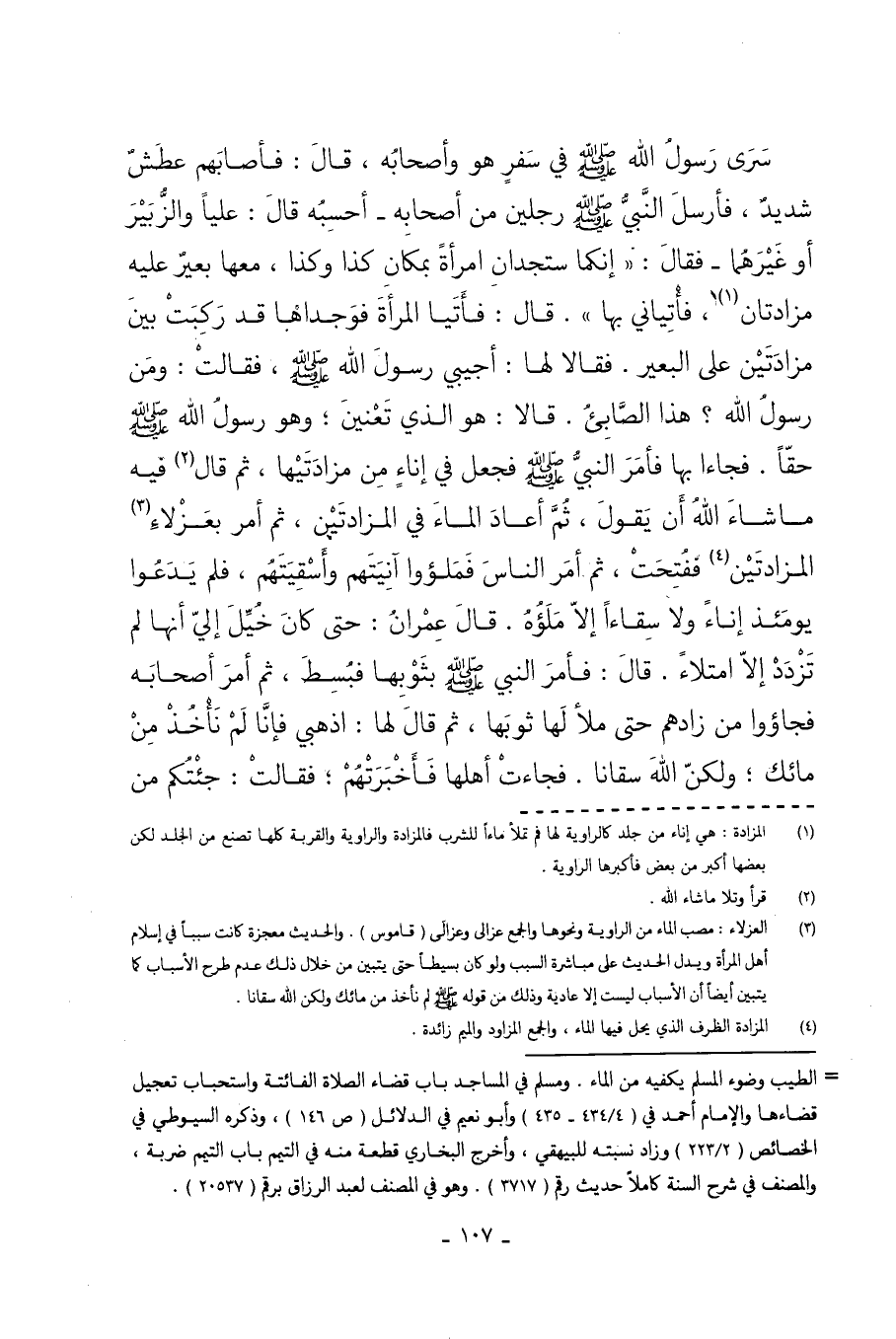 سَرَى رَسُولُ اللَّهِ صَلَّى اللهُ عَلَيْهِ وَسَلَّمَ فِي سَفَرٍ هُوَ وَأَصْحَابُهُ قَالَ فَأَصَابَهُمْ عَطَشٌ شَدِيدٌ فَأَرْسَلَ النَّبِيُّ صَلَّى اللهُ عَلَيْهِ وَسَلَّمَ رَجُلَيْنِ مِنْ أَصْحَابِهِ أَحْسَبُهُ قَالَ عَلِيًّا وَالزُّبَيْرَ أَوْ غَيْرَهُمَا فَقَالَ إِنَّكُمَا سَتَجِدَانِ امْرَأَةً بِمَكَانِ كَذَا وَكَذَا مَعَهَا بَعِيرٌ عَلَيْهِ مَزَادَتَانِ فَأْتِيَانِي بِهَا قَالَ فَأَتَيَا الْمَرْأَةَ فَوَجَدَاهَا قَدْ رَكِبَتْ بَيْنَ مَزَادَتَيْنِ عَلَى الْبَعِيرِ فَقَالا لَهَا أَجِيبِي رَسُولَ اللَّهِ صَلَّى اللهُ عَلَيْهِ وَسَلَّمَ فَقَالَتْ وَمَنْ رَسُولُ اللَّهِ هَذَا الصَّابِئُ قَالا هُوَ الَّذِي تَعْنِينَ وَهُوَ رَسُولُ اللَّهِ صَلَّى اللهُ عَلَيْهِ وَسَلَّمَ حَقًّا فَجَاءَا بِهَا فَأَمَرَ النَّبِيُّ صَلَّى اللهُ عَلَيْهِ وَسَلَّمَ فَجَعَلَ فِي إِنَاءٍ مِنْ مَزَادَتَيْهَا ثُمَّ قَالَ فِيهِ مَا شَاءَ اللَّهُ أَنْ يَقُولَ ثُمَّ أَعَادَ الْمَاءَ فِي الْمَزَادَتَيْنِ ثُمَّ أَمَرَ بِعَزْلاءِ الْمَزَادَتَيْنِ فَفُتِحَتْ ثُمَّ أمر الناس فملؤوا آنِيَتَهُمْ وَأَسْقِيَتَهُمْ فَلَمْ يَدَعُوا يَوْمَئِذٍ إِنَاءً وَلا سقاء إلا ملؤه قَالَ عِمْرَانُ حَتَّى كَانَ خُيِّلَ إِلَيَّ أَنَّهَا لَمْ تَزْدَدْ إِلا امْتِلاءً قَالَ فَأَمَرَ النَّبِيُّ صَلَّى اللهُ عَلَيْهِ وَسَلَّمَ بِثَوْبِهَا فَبُسِطَ ثُمَّ أمر أصحابه فجاؤوا مِنْ زَادِهِمْ حَتَّى مَلا لَهَا ثَوْبَهَا ثُمَّ قَالَ لَهَا اذْهَبِي فَإِنَّا لَمْ نَأْخُذْ مِنْ مَائِكِ وَلَكِنَّ اللَّهَ سَقَانَا فَجَاءَتْ أَهْلَهَا فَأَخْبَرَتْهُمْ فَقَالَتْ جِئْتُكُمْ مِنْ