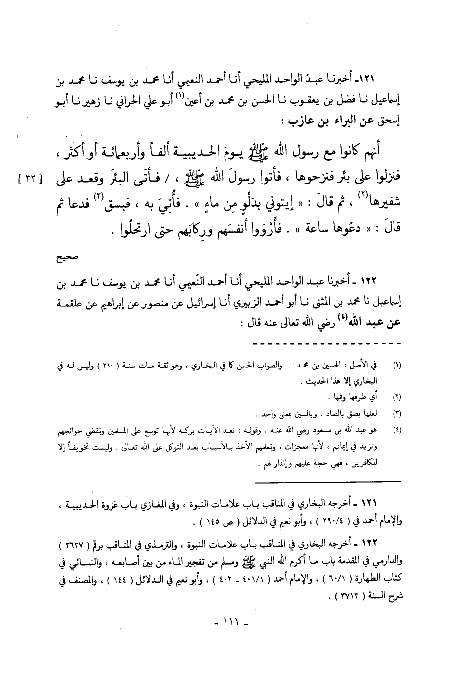 121 - أَخْبَرَنَا عَبْدُ الْوَاحِدِ الْمَلِيحِيُّ أَنَا أَحْمَدُ النُّعَيْمِيُّ أَنَا مُحَمَّدُ بْنُ يُوسُفَ نا مُحَمَّدُ بْنُ إِسْمَاعِيلَ نا فَضْلُ بْنُ يَعْقُوبَ نا الْحَسَنُ بْنُ مُحَمَّدِ بْنِ أَعْيَنَ أَبُو عَلِيٍّ الْحَرَّانِيُّ نا زُهَيْرٌ نا أبو إسحق عَنِ الْبَرَاءِ بْنِ عَازِبٍ أَنَّهُمْ كَانُوا مَعَ رَسُولِ اللَّهِ صَلَّى اللهُ عَلَيْهِ وَسَلَّمَ يَوْمَ الحديبية ألفا وأربعمائة أَوْ أَكْثَرَ فَنَزَلُوا عَلَى بِئْرٍ فَنَزَحُوهَا فَأَتَوْا رَسُولَ اللَّهِ صَلَّى اللهُ عَلَيْهِ وَسَلَّمَ فَأَتَى الْبِئْرَ وَقَعَدَ عَلَى شَفِيرِهَا ثُمَّ قَالَ إِيتُونِي بِدَلْوٍ مِنْ مَاءٍ فأتي به فبسق فَدَعَا ثُمَّ قَالَ دَعُوهَا سَاعَةً فَأَرْوَوْا أَنْفُسَهُمْ وَرِكَابَهُمْ حتى ارتحلوا. صحيح
