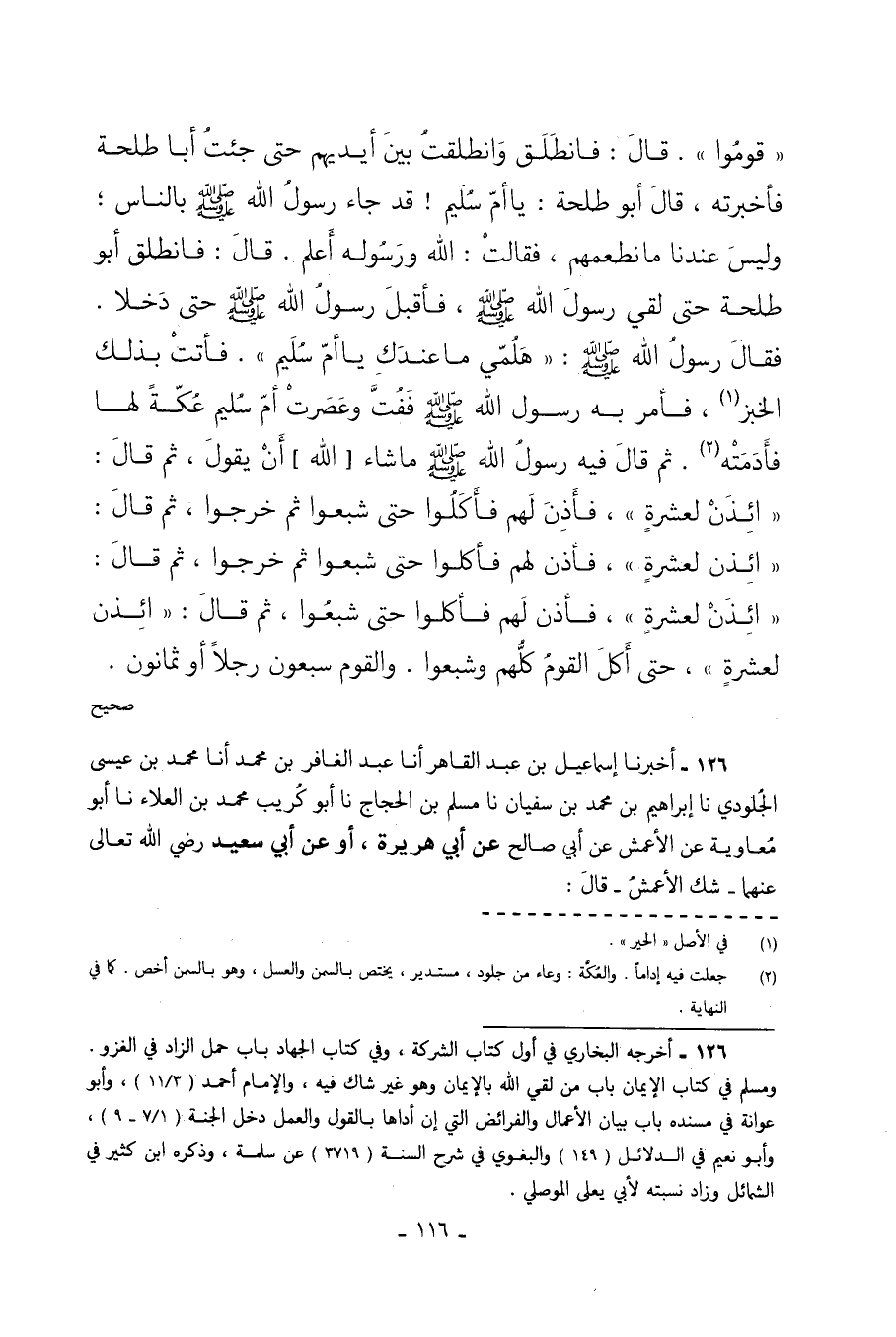قُومُوا قَالَ فَانْطَلَقَ وَانْطَلَقْتُ بَيْنَ أَيْدِيهِمْ حَتَّى جِئْتُ أَبَا طَلْحَةَ فَأَخْبَرْتُهُ قَالَ أَبُو طَلْحَةَ يَا أُمَّ سُلَيْمٍ قَدْ جَاءَ رَسُولُ اللَّهِ صَلَّى اللهُ عَلَيْهِ وَسَلَّمَ بِالنَّاسِ وَلَيْسَ عِنْدَنَا مَا نُطْعِمُهُمْ فَقَالَتْ اللَّهُ وَرَسُولُهُ أَعْلَمُ قَالَ فَانْطَلَقَ أَبُو طَلْحَةَ حَتَّى لَقِيَ رَسُولَ اللَّهِ صَلَّى اللهُ عَلَيْهِ وَسَلَّمَ فَأَقْبَلَ رَسُولُ اللَّهِ صَلَّى اللهُ عَلَيْهِ وَسَلَّمَ حَتَّى دَخَلا فَقَالَ رَسُولُ اللَّهِ صَلَّى اللهُ عَلَيْهِ وَسَلَّمَ هَلُمِّي مَا عِنْدَكِ يَا أُمَّ سُلَيْمٍ فَأَتَتْ بِذَلِكَ الْخُبْزِ فَأَمَرَ بِهِ رَسُولُ اللَّهِ صَلَّى اللهُ عَلَيْهِ وَسَلَّمَ فَفُتَّ وَعَصَرَتْ أُمُّ سُلَيْمٍ عُكَّةً لَهَا فَأَدَمَتْهُ ثُمَّ قَالَ فِيهِ رَسُولُ اللَّهِ صَلَّى اللهُ عَلَيْهِ وَسَلَّمَ مَا شَاءَ اللَّهُ أَنْ يَقُولَ ثُمَّ قَالَ ائْذَنْ لِعَشَرَةٍ فَأَذِنَ لَهُمْ فَأَكَلُوا حَتَّى شَبِعُوا ثُمَّ خَرَجُوا ثُمَّ قَالَ ائْذَنْ لِعَشَرَةٍ فَأَذِنَ لَهُمْ فَأَكَلُوا حَتَّى شَبِعُوا ثُمَّ خَرَجُوا ثُمَّ قَالَ ائْذَنْ لِعَشَرَةٍ فَأَذِنَ لَهُمْ فَأَكَلُوا حَتَّى شَبِعُوا ثُمَّ قَالَ ائْذَنْ لِعَشَرَةٍ حَتَّى أَكَلَ الْقَوْمُ كُلُّهُمْ وَشَبِعُوا وَالْقَوْمُ سَبْعُونَ رَجُلا أو ثمانون. صحيح