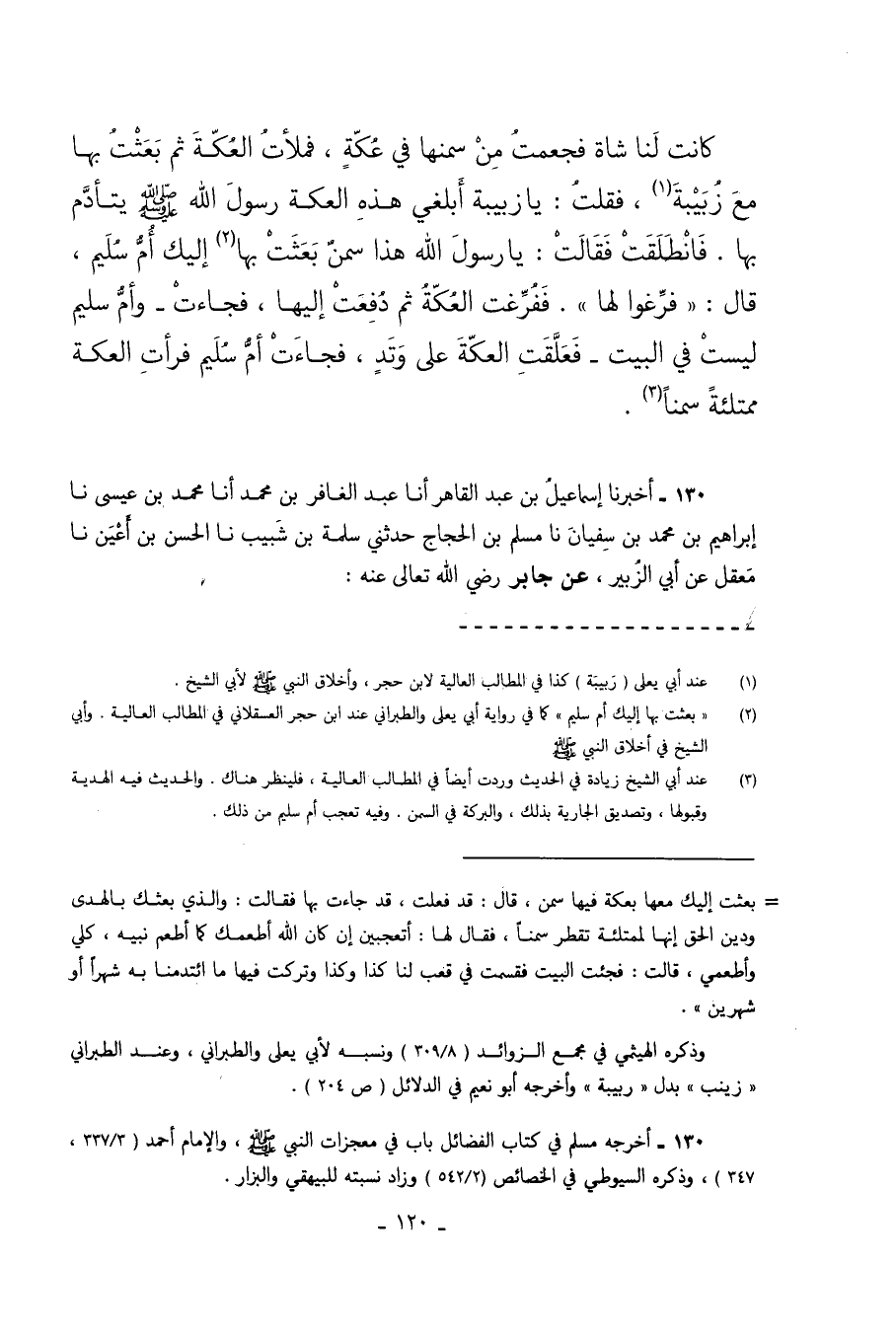 130 - أَخْبَرَنَا إِسْمَاعِيلُ بْنُ عَبْدِ الْقَاهِرِ أَنَا عَبْدُ الْغَافِرِ بْنُ مُحَمَّدٍ أَنَا مُحَمَّدُ بْنُ عِيسَى نا إِبْرَاهِيمُ بْنُ مُحَمَّدِ بْنِ سُفْيَانَ نا مُسْلِمُ بْنُ الْحَجَّاجِ حَدَّثَنِي سَلَمَةُ بْنُ شَبِيبٍ نا الْحَسَنُ بْنُ أَعْيَنَ نا مَعْقِلٌ عَنْ أَبِي الزُّبَيْرِ عَنْ جَابِرٍ رَضِيَ اللَّهُ تَعَالَى عَنْهُ:
