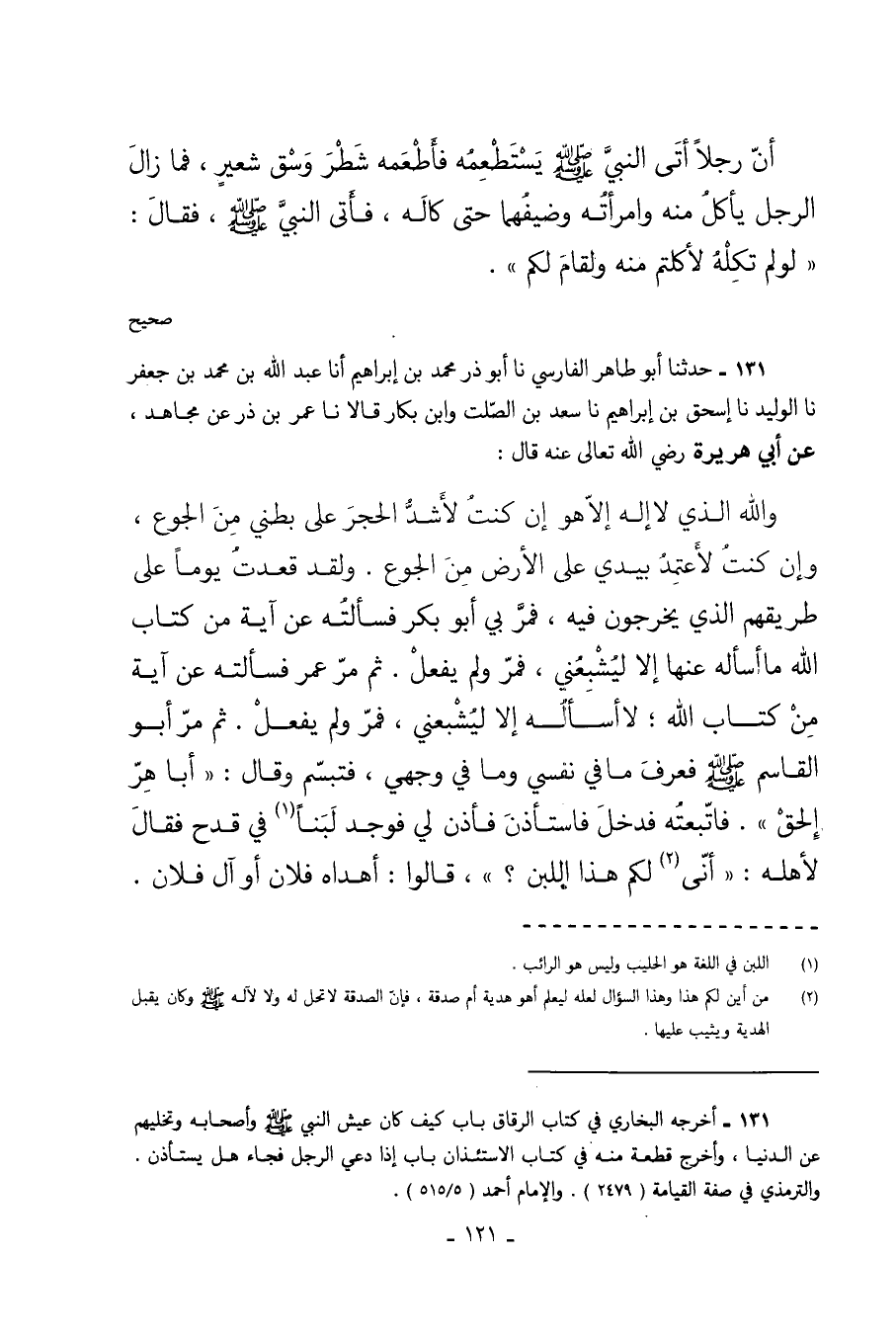 131 - حَدَّثَنَا أَبُو طَاهِرٍ الْفَارِسِيُّ نا أَبُو ذَرٍّ مُحَمَّدُ بْنُ إِبْرَاهِيمَ أَنَا عَبْدُ اللَّهِ بْنُ مُحَمَّدِ بْنِ جَعْفَرٍ نا الوليد نا إسحق بْنُ إِبْرَاهِيمَ نا سَعْدُ بْنُ الصَّلْتِ وَابْنُ بَكَّارٍ قَالا نا عُمَرُ بْنُ ذَرٍّ عَنْ مُجَاهِدٍ عَنْ أَبِي هُرَيْرَةَ رَضِيَ اللَّهُ تَعَالَى عَنْهُ قَالَ وَاللَّهِ الَّذِي لا إِلَهَ إِلا هُوَ إِنْ كُنْتُ لأَشُدُّ الْحَجَرَ عَلَى بَطْنِي مِنَ الْجُوعِ وَإِنْ كُنْتُ لأَعْتَمِدُ بِيَدَيَّ عَلَى الأَرْضِ مِنَ الْجُوعِ وَلَقَدْ قَعَدْتُ يَوْمًا عَلَى طَرِيقِهِمُ الَّذِي يَخْرُجُونَ فِيهِ فَمَرَّ بِي أَبُو بَكْرٍ فَسَأَلْتُهُ عَنْ آيَةٍ مِنْ كِتَابِ اللَّهِ مَا أَسْأَلُهُ عَنْهَا إِلا لِيُشْبِعَنِي فَمَرَّ وَلَمْ يَفْعَلْ ثُمَّ مَرَّ عُمَرُ فَسَأَلْتُهُ عَنْ آيَةٍ مِنْ كِتَابِ اللَّهِ لا أَسْأَلُهُ إِلا لِيُشْبِعَنِي فَمَرَّ وَلَمْ يَفْعَلْ ثُمَّ مَرَّ أَبُو الْقَاسِمِ صَلَّى اللهُ عَلَيْهِ وَسَلَّمَ فَعَرَفَ مَا فِي نَفْسِي وَمَا فِي وَجْهِي فَتَبَسَّمَ وَقَالَ أَبَا هِرَّ الْحَقْ فَاتَّبَعْتُهُ فَدَخَلَ فَاسْتَأْذَنَ فَأَذِنَ لِي فَوَجَدَ لَبَنًا فِي قَدَحٍ فَقَالَ لأَهْلِهِ أَنَّى لَكُمْ هَذَا اللَّبَنُ قَالُوا أَهْدَاهُ فُلانٌ أَوْ آلُ فُلانٍ