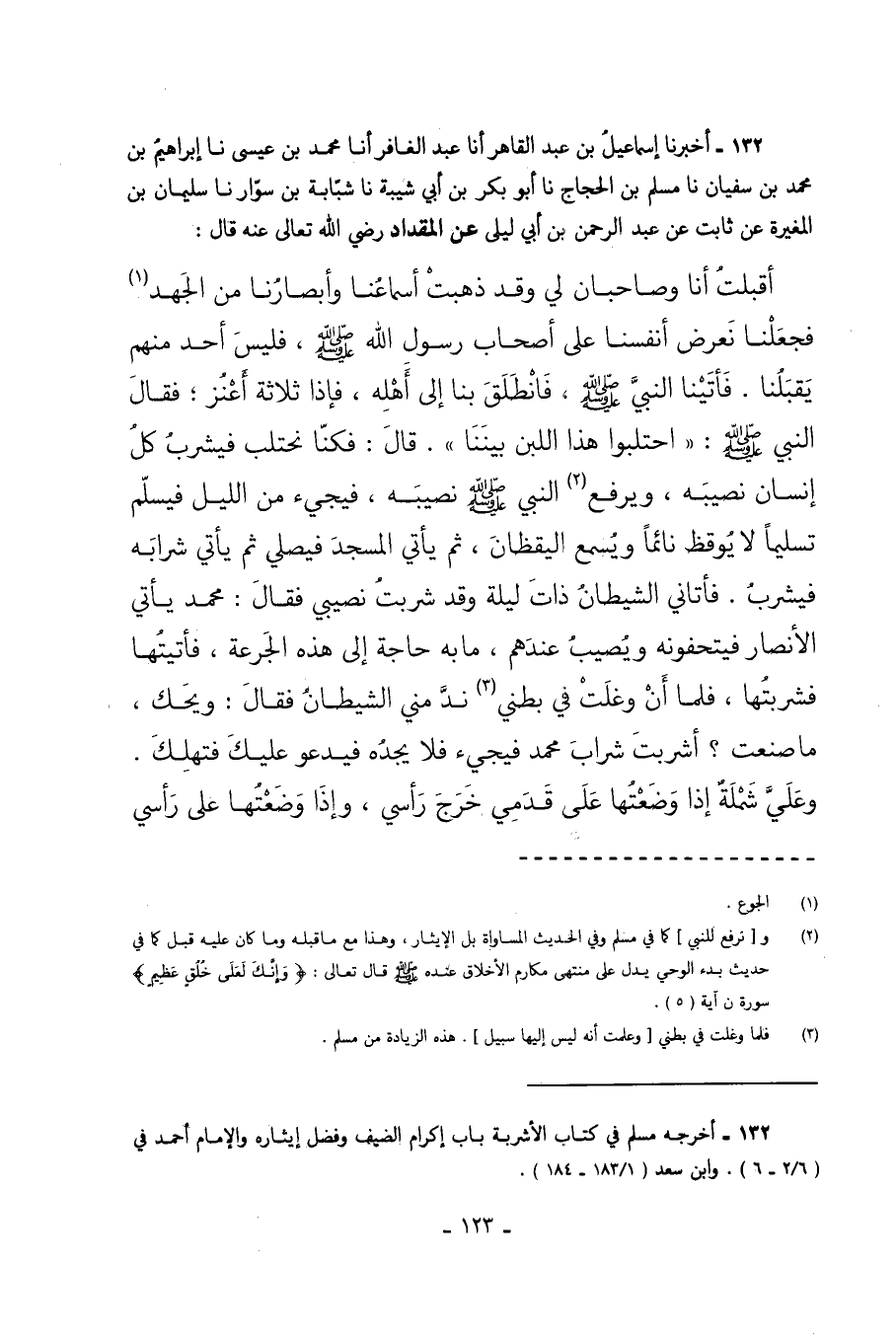 132 - أَخْبَرَنَا إِسْمَاعِيلُ بْنُ عَبْدِ الْقَاهِرِ أَنَا عَبْدُ الْغَافِرِ أَنَا مُحَمَّدُ بْنُ عِيسَى نا إِبْرَاهِيمُ بْنُ مُحَمَّدِ بْنِ سُفْيَانَ نا مُسْلِمُ بْنُ الْحَجَّاجِ نا أَبُو بَكْرِ بْنُ أَبِي شَيْبَةَ نا شَبَابَةُ بْنُ سَوَّارٍ نا سُلَيْمَانُ بْنُ الْمُغِيرَةِ عَنْ ثَابِتٍ عَنْ عَبْدِ الرَّحْمَنِ بْنِ أَبِي لَيْلَى عَنْ الْمِقْدَادِ رَضِيَ اللَّهُ تَعَالَى عَنْهُ قَالَ أَقْبَلْتُ أَنَا وَصَاحِبَانِ لِي وَقَدْ ذَهَبَتْ أَسْمَاعُنَا وَأَبْصَارُنَا مِنَ الْجَهْدِ فَجَعَلْنَا نَعْرِضُ أَنْفُسَنَا عَلَى أَصْحَابِ رَسُولِ اللَّهِ صَلَّى اللهُ عَلَيْهِ وَسَلَّمَ فَلَيْسَ أَحَدٌ مِنْهُمْ يَقْبَلُنَا فَأَتَيْنَا النَّبِيَّ صَلَّى اللهُ عَلَيْهِ وَسَلَّمَ فَانْطَلَقَ بِنَا إِلَى أَهْلِهِ فَإِذَا ثَلاثَةُ أَعْنُزٍ فَقَالَ النَّبِيُّ صَلَّى اللهُ عَلَيْهِ وَسَلَّمَ احْتَلِبُوا هَذَا اللَّبَنَ بَيْنَنَا قَالَ فَكُنَّا نَحْتَلِبُ فَيَشْرَبُ كُلُّ إِنْسَانٍ نَصِيبَهُ وَيَرْفَعُ النَّبِيُّ صَلَّى اللهُ عَلَيْهِ وَسَلَّمَ نَصِيبَهُ فَيَجِيءُ مِنَ اللَّيْلِ فَيُسَلِّمُ تَسْلِيمًا لا يُوقِظُ نَائِمًا وَيُسْمِعُ الْيَقْظَانَ ثُمَّ يَأْتِي الْمَسْجِدَ فَيُصَلِّي ثُمَّ يَأْتِي شَرَابَهُ فَيَشْرَبُ فَأَتَانِي الشَّيْطَانُ ذَاتَ لَيْلَةٍ وَقَدْ شَرِبْتُ نَصِيبِي فَقَالَ مُحَمَّدٌ يَأْتِي الأَنْصَارَ فَيُتْحِفُونَهُ وَيُصِيبُ عِنْدَهُمْ مَا بِهِ حَاجَةٌ إِلَى هَذِهِ الْجَرْعَةِ فَأَتَيْتُهُا فَشَرِبْتُهَا فَلَمَّا أَنْ وَغَلَتْ في بطني ند مني الشَّيْطَانُ فَقَالَ وَيْحَكَ مَا صَنَعْتَ أَشَرِبْتَ شَرَابَ مُحَمَّدٍ فَيَجِيءُ فَلا يَجِدُهُ فَيَدْعُو عَلَيْكَ فَتَهْلِكَ وَعَلَيَّ شَمْلَةٌ إِذَا وَضَعْتُهَا عَلَى قَدَمَيَّ خَرَجَ رَأْسِي وَإِذَا وَضَعْتُهَا عَلَى رَأْسِي