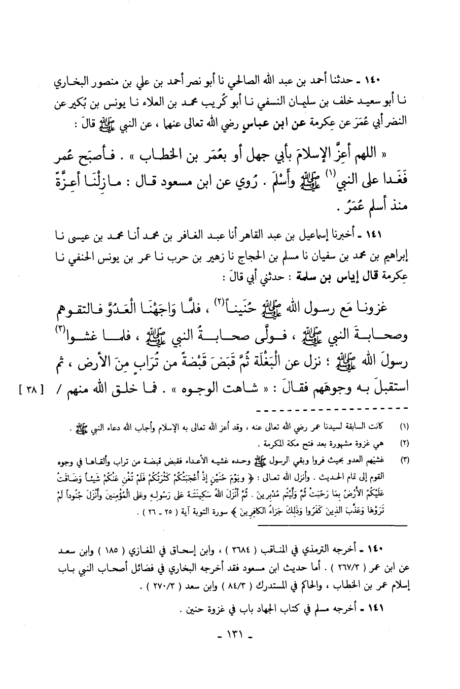 141 - أَخْبَرَنَا إِسْمَاعِيلُ بْنُ عَبْدِ الْقَاهِرِ أَنَا عَبْدُ الْغَافِرِ بْنُ مُحَمَّدٍ أَنَا مُحَمَّدُ بْنُ عِيسَى نا إِبْرَاهِيمُ بْنُ مُحَمَّدِ بْنِ سُفْيَانَ نا مُسْلِمُ بْنُ الْحَجَّاجِ نا زُهَيْرُ بْنُ حَرْبٍ نا عُمَرُ بْنُ يُونُسَ الْحَنَفِيُّ نا عِكْرِمَةُ قَالَ إِيَاسُ بْنُ سَلَمَةَ حَدَّثَنِي أَبِي قَالَ غَزَوْنَا مَعَ رَسُولِ اللَّهِ صَلَّى اللهُ عَلَيْهِ وَسَلَّمَ حُنَيْنًا فَلَمَّا وَاجَهْنَا الْعَدُوَّ فَالْتَقَوْهُمْ وَصَحَابَةَ النَّبِيِّ صَلَّى اللهُ عَلَيْهِ وَسَلَّمَ فَوَلَّى صَحَابَةُ النَّبِيِّ صَلَّى اللهُ عَلَيْهِ وَسَلَّمَ فَلَمَّا غَشَوْا رَسُولَ اللَّهِ صَلَّى اللهُ عَلَيْهِ وَسَلَّمَ نَزَلَ عَنِ الْبَغْلَةِ ثُمَّ قَبَضَ قَبْضَةً مِنْ تُرَابٍ مِنَ الأَرْضِ ثُمَّ اسْتَقْبَلَ بِهِ وُجُوهَهُمْ فَقَالَ شَاهَتِ الْوُجُوهُ فَمَا خَلَقَ اللَّهُ مِنْهُمْ