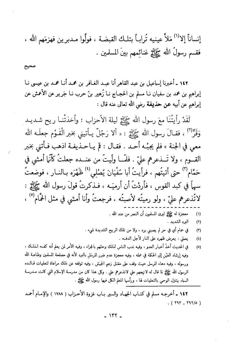 142 - أَخْبَرَنَا إِسْمَاعِيلُ بْنُ عَبْدِ الْقَاهِرِ أَنَا عَبْدُ الْغَافِرِ بْنُ مُحَمَّدٍ أَنَا مُحَمَّدُ بْنُ عِيسَى نا إِبْرَاهِيمُ بْنُ مُحَمَّدِ بْنِ سُفْيَانَ نا مُسْلِمُ بْنُ الْحَجَّاجِ نا زُهَيْرُ بْنُ حَرْبٍ نا جَرِيرٌ عَنِ الأَعْمَشِ عَنْ إِبْرَاهِيمَ عَنْ أَبِيهِ عَنْ حُذَيْفَةَ رَضِيَ اللَّهُ تَعَالَى عَنْهُ قَالَ لَقَدْ رَأَيْتُنَا مَعَ رَسُولِ اللَّهِ صَلَّى اللهُ عَلَيْهِ وَسَلَّمَ لَيْلَةَ الأَحْزَابِ وأخذتنا ريح شديدة وَقُرٌّ فَقَالَ رَسُول اللَّهِ صَلَّى اللهُ عَلَيْهِ وَسَلَّمَ أَلا رَجُلٌ يَأْتِينِي بِخَبَرِ الْقَوْمِ جَعَلَهُ اللَّهُ مَعِي فِي الْجَنَّةِ فَلَمْ يُجِبْهُ أَحَدٌ فَقَالَ قُمْ يَا حُذَيْفَةُ اذْهَبْ فَأْتِنِي بِخَبَرِ الْقَوْمِ وَلا تَذْعَرْهُمْ عَلَيَّ فَلَمَّا وَلَّيْتُ مِنْ عِنْدِهِ جَعَلْتُ كَأَنَّمَا أَمْشِي فِي حَمَّامٍ حَتَّى أَتَيْتُهُمْ فَرَأَيْتُ أَبَا سُفْيَانَ يُصْلِي ظَهْرَهُ بِالنَّارِ فَوَضَعْتُ سَهْمًا فِي كَبِدِ الْقَوْسِ فَأَرَدْتُ أَنْ أَرْمِيَهُ فَذَكَرْتُ قَوْلَ رَسُولِ اللَّهِ صَلَّى اللهُ عَلَيْهِ وَسَلَّمَ لا تَذْعَرْهُمْ عَلَيَّ وَلَوْ رَمَيْتُهُ لأَصَبْتُهُ فَرَجَعْتُ وَأَنَا أَمْشِي فِي مِثْلِ الْحَمَّامِ،