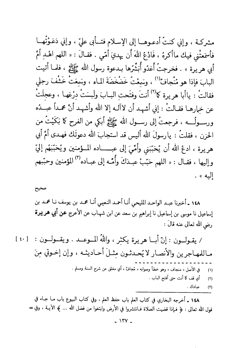 مُشْرِكَةٌ وَإِنُّي كُنْتُ أَدْعُوهَا إِلَى الإِسْلامِ فَتَأْبَى عَلَيَّ وَإِنِّي دَعَوْتُهَا فَأَسْمَعَتْنِي فِيكَ مَا أَكْرَهُ فَادْعُ اللَّهَ أَنْ يَهْدِيَ أُمِّي فَقَالَ اللَّهُمَّ اهْدِ أُمَّ أَبِي هُرَيْرَةَ فَخَرَجْتُ أَغْدُو أُبَشِّرُهَا بِدَعْوَةِ رَسُولِ اللَّهِ صَلَّى اللهُ عَلَيْهِ وَسَلَّمَ فَلَمَّا أَتَيْتُ الْبَابَ فإذا هو منجاف وَسَمِعْتُ خَضْخَضَةَ الْمَاءِ وَسَمِعَتْ خَشْفَ رِجْلَيَّ فَقَالَتْ يَا أَبَا هُرَيْرَةَ كَمَا أَنْتَ وَفَتَحَتِ الْبَابَ وَلَبِسَتْ دِرْعَهَا وَعَجِلَتْ عَنْ خِمَارِهَا فَقَالَتْ إِنِّي أَشْهَدُ أَنْ لا إِلَهَ إِلا اللَّهُ وَأَشْهَدُ أَنَّ مُحَمَّدًا عَبْدَهُ وَرَسُولَهُ فَرَجَعْتُ إِلَى رَسُولِ اللَّهِ صَلَّى اللهُ عَلَيْهِ وَسَلَّمَ أَبْكِي مِنَ الْفَرَحِ كَمَا بَكَيْتُ مِنَ الْحُزْنِ فَقُلْتُ يَا رَسُولَ اللَّهِ أَلَيْسَ قَدِ اسْتَجَابَ اللَّهُ دَعْوَتَكَ فَهَدَى أُمَّ أَبِي هُرَيْرَةَ ادْعُ اللَّهَ أَنْ يُحَبِّبَنِي وَأُمِّي إِلَى عِبَادِهِ الْمُؤْمِنِينَ وَيُحَبِّبَهُمْ إِلَيَّ وَإِلَيْهَا فَقَالَ اللَّهُمَّ حَبِّبْ عَبْدَكَ وَأُمَّهُ إِلَى عِبَادِهِ الْمُؤْمِنِينَ وحببهم إليه. صحيح