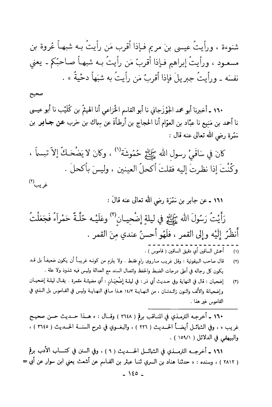 160 - أَخْبَرَنَا أَبُو مُحَمَّدٍ الْجُوزَجَانِيُّ نا أَبُو الْقَاسِمِ الْخُزَاعِيُّ أَنَا الْهَيْثَمُ بْنُ كُلَيْبٍ نا أَبُو عِيسَى نا أَحْمَدُ بْنُ مَنِيعٍ نا عَبَّادُ بْنُ الْعَوَّامِ أَنَا الْحَجَّاجُ بْنُ أَرْطَأَةَ عَنْ سِمَاكِ بْنِ حَرْبٍ عَنْ جَابِرِ بْنِ سَمُرَةَ رَضِيَ اللَّهُ تَعَالَى عَنْهُ قَالَ كَانَ فِي سَاقَيْ رَسُولِ اللَّهِ صَلَّى اللهُ عَلَيْهِ وَسَلَّمَ حُمُوشَةٌ وَكَانَ لا يَضْحَكُ إِلا تَبَسُّمًا وَكُنْتُ إِذَا نَظَرْتُ إِلَيْهِ فَقُلْتُ أَكْحَلُ الْعَيْنَيْنِ وليس بأكحل. غريب