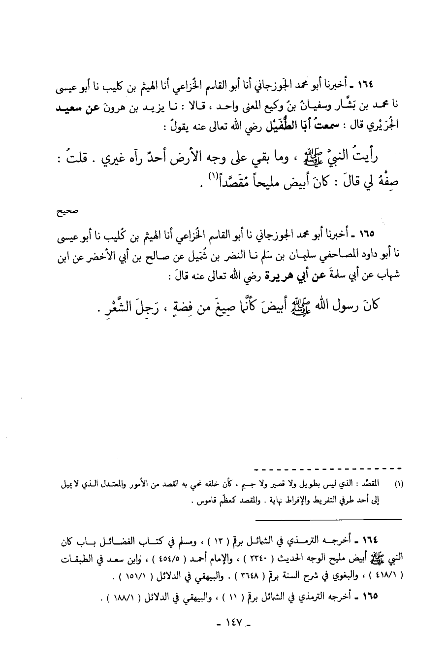 164 - أَخْبَرَنَا أَبُو مُحَمَّدٍ الْجُوزَجَانِيُّ أَنَا أَبُو الْقَاسِمِ الْخُزَاعِيُّ أَنَا الْهَيْثَمُ بْنُ كُلَيْبٍ نا أَبُو عِيسَى نا مُحَمَّدُ بْنُ بَشَّارٍ وَسُفْيَانُ بْنُ وَكِيعٍ الْمَعْنَى وَاحِدٌ قَالا نا يزيد بن هرون عَنْ سَعِيدٍ الْجُرَيْرِيِّ قَالَ سَمِعْتُ أَبَا الطُّفَيْلِ رَضِيَ اللَّهُ تَعَالَى عَنْهُ يَقُولُ رَأَيْتُ النَّبِيَّ صَلَّى اللهُ عَلَيْهِ وَسَلَّمَ وَمَا بَقِيَ عَلَى وَجْهِ الأَرْضِ أَحَدٌ رَآهُ غَيْرِي قُلْتُ صِفْهُ لِي قَالَ كَانَ أَبْيَضَ مليحا مقصدا. صحيح