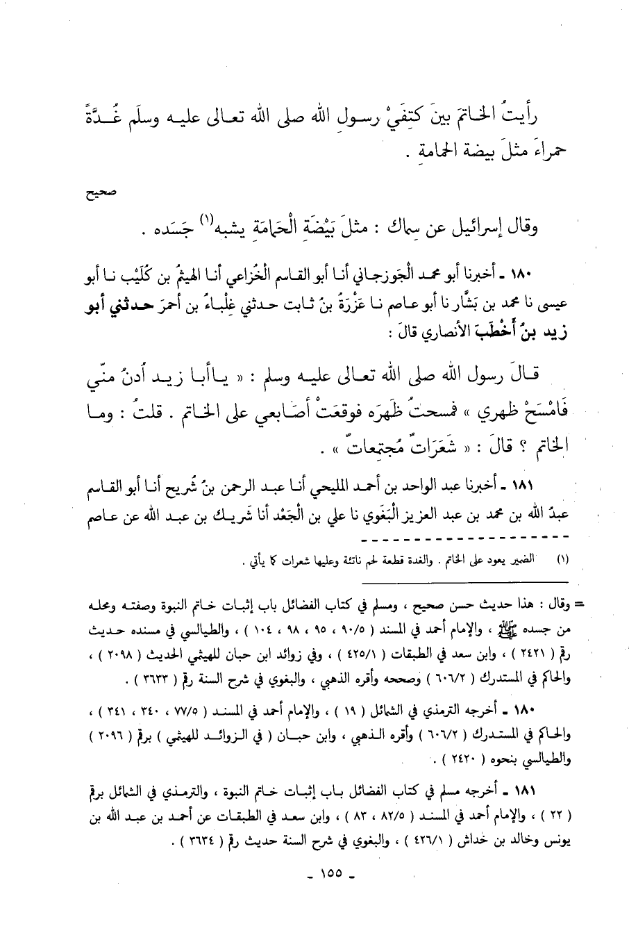 180 - أَخْبَرَنَا أَبُو مُحَمَّدٍ الْجُوزَجَانِيُّ أَنَا أَبُو الْقَاسِمِ الْخُزَاعِيُّ أَنَا الْهَيْثَمُ بْنُ كُلَيْبٍ نا أَبُو عِيسَى نا مُحَمَّدُ بْنُ بَشَّارٍ نا أَبُو عَاصِمٍ نا عَزْرَةُ بْنُ ثابت حدثني غلباء بْنُ أَحْمَرَ حَدَّثَنِي أَبُو زَيْدِ بْنُ أَخْطَبَ الأَنْصَارِيُّ قَالَ قَالَ رَسُولُ اللَّهِ صَلَّى اللَّهُ تَعَالَى عَلَيْهِ وَسَلَّمَ يَا أَبَا زَيْدٍ ادْنُ مِنِّي فَامْسَحْ ظَهْرِي فَمَسَحْتُ ظَهْرَهُ فَوَقَعَتْ أَصَابِعِي عَلَى الْخَاتَمِ قُلْتُ وَمَا الْخَاتَمُ قَالَ شَعَرَاتٌ مُجْتَمِعَاتٌ.