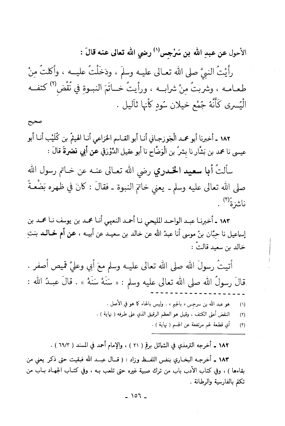 الأَحْوَلِ عَنْ عَبْدِ اللَّهِ بْنِ سَرْجِسٍ رَضِيَ اللَّهُ تَعَالَى عَنْهُ قَالَ رَأَيْتُ النَّبِيَّ صَلَّى اللَّهُ تَعَالَى عَلَيْهِ وَسَلَّمَ وَدَخَلْتُ عَلَيْهِ وَأَكَلْتُ مِنْ طَعَامِهِ وَشَرِبْتُ مِنْ شَرَابِهِ وَرَأَيْتُ خَاتَمَ النُّبُوَّةِ فِي نُقْضِ كَتِفِهِ الْيُسْرَى كَأَنَّهُ جُمْعُ خِيلانٍ سُودٍ كأنها ثآليل. صحيح