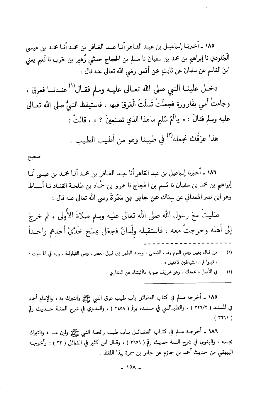 185 - أَخْبَرَنَا إِسْمَاعِيلُ بْنُ عَبْدِ الْقَاهِرِ أَنَا عَبْدُ الْغَافِرِ بْنُ مُحَمَّدٍ أَنَا مُحَمَّدُ بْنُ عِيسَى الْجُلُودِيُّ نا إِبْرَاهِيمُ بْنُ مُحَمَّدِ بْنِ سُفْيَانَ نا مُسْلِمُ بْنُ الْحَجَّاجِ حَدَّثَنِي زُهَيْرُ بْنُ حرب نا نعيم يَعْنِي ابْنَ الْقَاسِمِ عَنْ سَلْمَانَ عَنْ ثِابِتٍ عَنْ أَنَسٍ رَضِيَ اللَّهُ تَعَالَى عَنْهُ قَالَ دَخَلَ عَلَيْنَا النَّبِيُّ صَلَّى اللَّهُ تَعَالَى عَلَيْهِ وَسَلَّمَ فَقَالَ عِنْدَنَا فَعَرِقَ وَجَاءَتْ أُمِّي بِقَارُورَةٍ فَجَعَلَتْ تَسْلُتُ الْعَرَقَ فِيهَا فَاسْتَيْقَظَ النَّبِيُّ صَلَّى اللَّهُ تَعَالَى عَلَيْهِ وَسَلَّمَ فَقَالَ يَا أُمَّ سُلَيْمٍ مَا هَذَا الَّذِي تَصْنَعِينَ قَالَتْ هَذَا عَرَقُكَ نَجْعَلُهُ فِي طِيبِنَا وَهُوَ مِنْ أطيب الطيب. صحيح