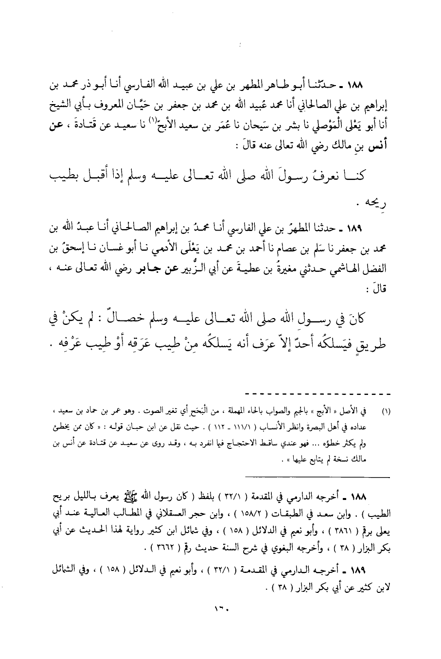 188 - حَدَّثَنَا أَبُو طَاهِرٍ الْمُطَهَّرُ بْنُ عَلِيِّ بْنِ عُبَيْدِ اللَّهِ الْفَارِسِيُّ أَنَا أَبُو ذَرٍّ مُحَمَّدُ بْنُ إِبْرَاهِيمَ بْنِ عَلِيٍّ الصَّالْحَانِيُّ أنا محمد عبيد اللَّهِ بْنُ مُحَمَّدِ بْنِ جَعْفَرِ بْنِ حَيَّانَ الْمَعْرُوفُ بِأَبِي الشَّيْخِ أَنَا أَبُو يَعْلَى الْمَوْصِلِيُّ نا بِشْرُ بْنُ سَيْحَانَ نا عُمَرُ بْنُ سَعِيدٍ الأَبَحُّ نا سَعِيدٌ عَنْ قَتَادَةَ عَنْ أَنَسِ بْنِ مَالِكٍ رَضِيَ اللَّهُ تَعَالَى عَنْهُ قَالَ كُنَّا نَعْرِفُ رَسُولَ اللَّهِ صَلَّى اللَّهُ تَعَالَى عَلَيْهِ وَسَلَّمَ إِذَا أَقْبَلَ بِطِيبِ رِيحِهِ.