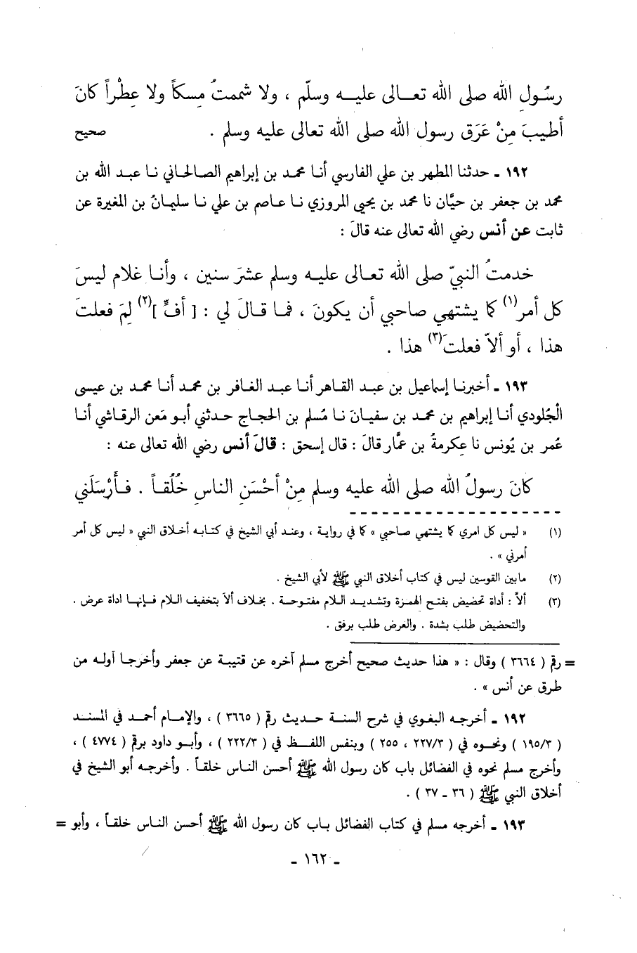 192 - حَدَّثَنَا الْمُطَهَّرُ بْنُ عَلِيٍّ الْفَارِسِيُّ أَنَا مُحَمَّدُ بْنُ إِبْرَاهِيمَ الصَّالْحَانِيُّ نا عَبْدُ اللَّهِ بْنُ مُحَمَّدِ بْنِ جَعْفَرِ بْنِ حَيَّانَ نا مُحَمَّدُ بْنُ يَحْيَى الْمَرْوَزِيُّ نا عَاصِمُ بْنُ عَلِيٍّ نا سُلَيْمَانُ بْنُ الْمُغِيرَةِ عَنْ ثَابِتٍ عَنْ أَنَسٍ رَضِيَ اللَّهُ تَعَالَى عَنْهُ قَالَ خَدَمْتُ النَّبِيَّ صَلَّى اللَّهُ تَعَالَى عَلَيْهِ وَسَلَّمَ عَشْرَ سِنِينَ وَأَنَا غُلامٌ لَيْسَ كُلُّ أَمْرٍ كَمَا يَشْتَهِي صَاحِبِي أَنْ يَكُونَ فَمَا قَالَ لِي أُفٍّ لِمَ فَعَلْتَ هَذَا أَوْ أَلا فَعَلْتَ هَذَا.