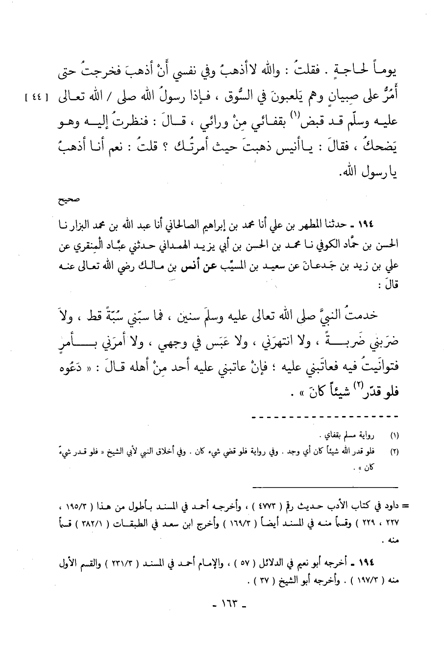 194 - حَدَّثَنَا الْمُطَهَّرُ بْنُ عَلِيٍّ أَنَا مُحَمَّدُ بْنُ إِبْرَاهِيمَ الصَّالْحَانِيُّ أَنَا عَبْدُ اللَّهِ بْنُ مُحَمَّدٍ الْبَزَّارُ نا الْحَسَنُ بْنُ حَمَّادٍ الْكُوفِيُّ نا مُحَمَّدُ بْنُ الْحَسَنِ بْنِ أَبِي يَزِيدَ الْهَمْدَانِيُّ حَدَّثَنِي عَبَّادٌ الْمِنْقَرِيُّ عَنْ عَلِيِّ بْنِ زَيْدِ بْنِ جُدْعَانَ عَنْ سَعِيدِ بْنِ الْمُسَيِّبِ عَنْ أَنَسِ بْنِ مَالِكٍ رَضِيَ اللَّهُ تَعَالَى عَنْهُ قَالَ خَدَمْتُ النَّبِيَّ صَلَّى اللَّهُ تَعَالَى عَلَيْهِ وَسَلَّمَ سِنِينَ فَمَا سَبَّنِي سُبَّةً قَطُّ وَلا ضَرَبَنِي ضَرْبَةً وَلا انْتَهَرَنِي وَلا عَبَسَ فِي وَجْهِي وَلا أَمَرَنِي بَأَمْرٍ فَتَوَانَيْتُ فِيهِ فَعَاتَبَنِي عَلَيْهِ فَإِنْ عَاتَبَنِي عَلَيْهِ أَحَدٌ مِنْ أَهْلِهِ قَالَ دَعُوهُ فَلَوْ قَدَّرَ شَيْئًا كَانَ.