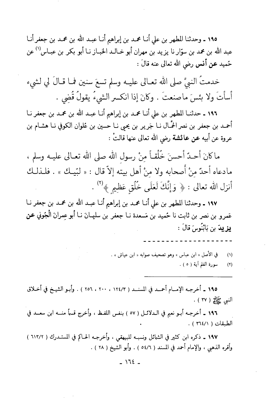 196 - حَدَّثَنَا الْمُطَهَّرُ بْنُ عَلِيٍّ أَنَا مُحَمَّدُ بْنُ إِبْرَاهِيمَ أَنَا عَبْدُ اللَّهِ بْنُ مُحَمَّدِ بْنِ جَعْفَرٍ نا أَحْمَدُ بْنُ جَعْفَرِ بْنِ نَصْرٍ الْحَمَّالُ نا جَرِيرُ بْنُ يَحْيَى نا حُسَيْنُ بْنُ عُلْوَانَ الْكُوفِيُّ نا هِشَامُ بْنُ عُرْوَةَ عَنْ أَبِيهِ عَنْ عَائِشَةَ رَضِيَ اللَّهُ تَعَالَى عَنْهَا قَالَتْ مَا كَانَ أَحَدٌ أَحْسَنَ خُلُقًا مِنْ رَسُولِ اللَّهِ صَلَّى اللَّهُ تَعَالَى عَلَيْهِ وَسَلَّمَ مَا دَعَاهُ أَحَدٌ مِنْ أَصْحَابِهِ وَلا مِنْ أَهْلِ بَيْتِهِ إِلا قَالَ لَبَّيْكَ فَلِذَلِكَ أَنْزَلَ اللَّهُ تَعَالَى وَإِنَّكَ لَعَلَى خُلُقٍ عَظِيمٍ.