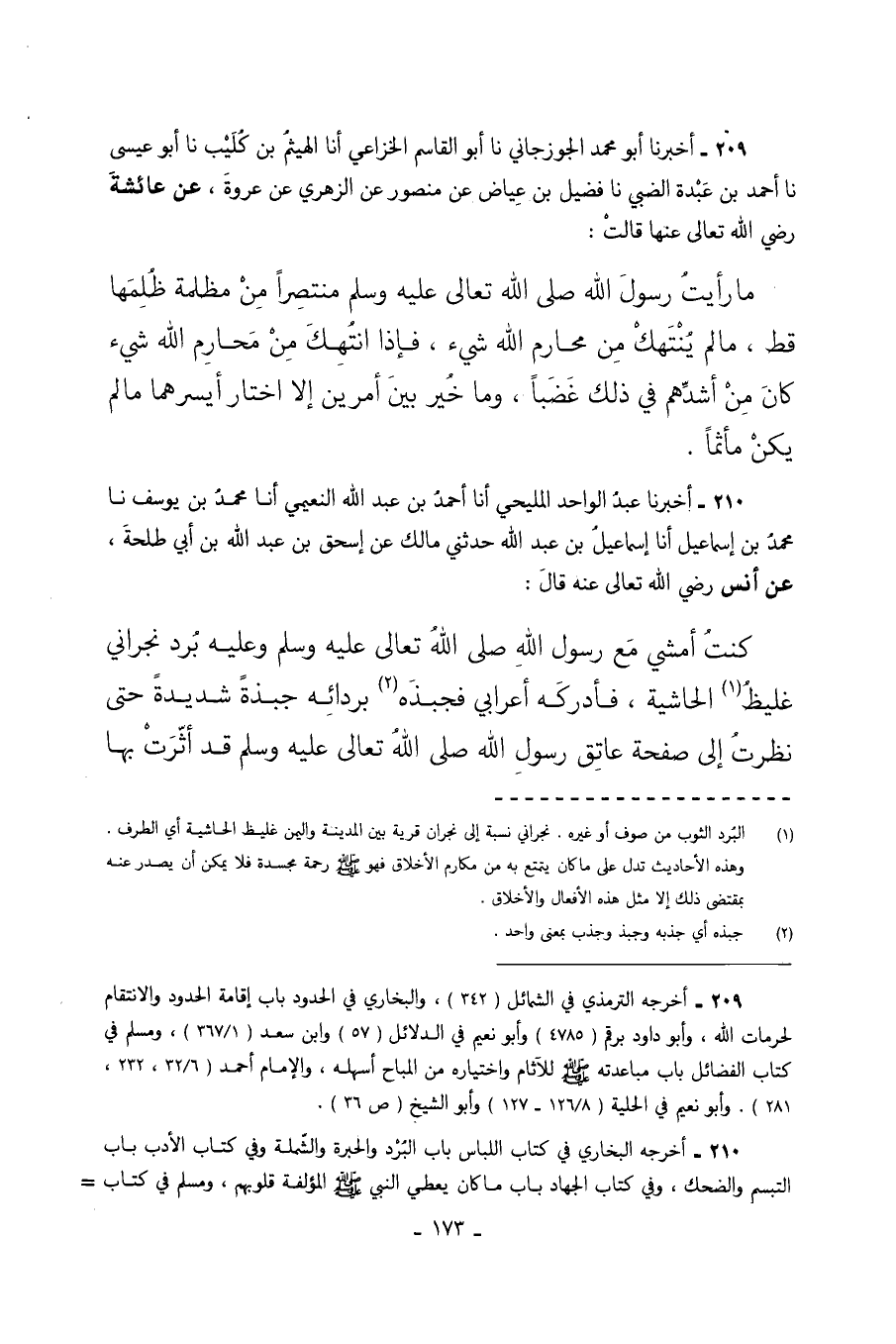 210 - أَخْبَرَنَا عَبْدُ الْوَاحِدِ الْمَلِيحِيُّ أَنَا أَحْمَدُ بْنُ عَبْدِ اللَّهِ النُّعَيْمِيُّ أَنَا مُحَمَّدُ بْنُ يُوسُفَ نا مُحَمَّدُ بْنُ إِسْمَاعِيلَ أَنَا إِسْمَاعِيلُ بْنُ عَبْدِ اللَّهِ حَدَّثَنِي مالك عن إسحق بْنِ عَبْدِ اللَّهِ بْنِ أَبِي طَلْحَةَ عَنْ أَنَسٍ رَضِيَ اللَّهُ تَعَالَى عَنْهُ قَالَ كُنْتُ أَمْشِي مَعَ رَسُولِ اللَّهِ صَلَّى اللَّهُ تَعَالَى عَلَيْهِ وَسَلَّمَ وَعَلَيْهِ بُرْدٌ نَجْرَانِيٌّ غَلِيظُ الْحَاشِيَةِ فَأَدْرَكَهُ أَعْرَابِيٌّ فَجَبَذَهُ بِرِدَائِهِ جَبْذَةً شَدِيدَةً حَتَّى نَظَرْتُ إِلَى صَفْحَةِ عَاتِقِ رَسُولِ اللَّهِ صَلَّى اللَّهُ تَعَالَى عَلَيْهِ وَسَلَّمَ قَدْ أَثَّرَتْ بِهَا