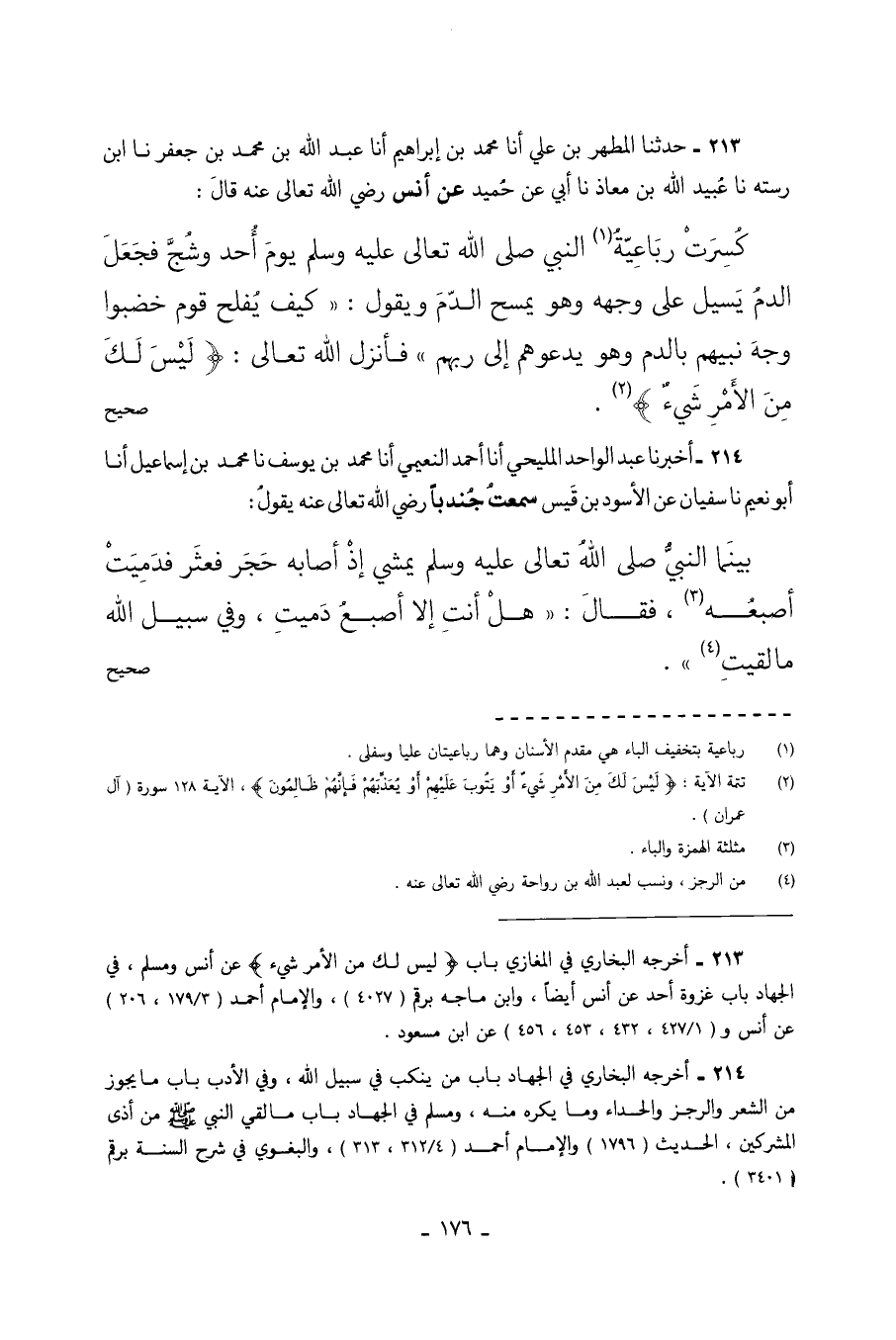 213 - حَدَّثَنَا الْمُطَهَّرُ بْنُ عَلِيٍّ أَنَا مُحَمَّدُ بْنُ إِبْرَاهِيمَ أَنَا عَبْدُ اللَّهِ بْنُ مُحَمَّدِ بْنِ جَعْفَرٍ نا ابْنُ رُسْتَهْ نا عُبَيْدُ اللَّهِ بْنُ مُعَاذٍ نا أَبِي عَنْ حُمَيْدٍ عَنْ أَنَسٍ رَضِيَ اللَّهُ تَعَالَى عَنْهُ قَالَ كُسِرَتْ رَبَاعِيَةُ النَّبِيِّ صَلَّى اللَّهُ تَعَالَى عَلَيْهِ وَسَلَّمَ يَوْمَ أُحُدٍ وَشُجَّ فَجَعَلَ الدَّمُ يَسِيلُ عَلَى وَجْهِهِ وَهُوَ يَمْسَحُ الدَّمَ وَيَقُولُ كَيْفَ يُفْلِحُ قَوْمٌ خَضَبُوا وَجْهَ نَبِيِّهِمْ بِالدَّمِ وَهُوَ يَدْعُوهُمْ إِلَى رَبِّهِمْ فَأَنْزَلَ اللَّهُ تَعَالَى لَيْسَ لَكَ مِنَ الأمر شيء. صحيح