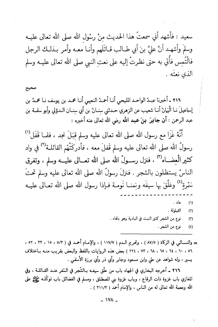 216 - أَخْبَرَنَا عَبْدُ الْوَاحِدِ الْمَلِيحِيُّ أَنَا أَحْمَدُ النُّعَيْمِيُّ أَنَا مُحَمَّدُ بْنُ يُوسُفَ نا مُحَمَّدُ بْنُ إِسْمَاعِيلَ نا الْيَمَانُ أَنَا شُعَيْبٌ عَنِ الزُّهْرِيِّ حَدَّثَنِي سِنَانُ بْنُ أَبِي سِنَانٍ الدُّؤَلِيُّ وَأَبُو سَلَمَةَ بْنُ عَبْدِ الرَّحْمَنِ أَنَّ جَابِرَ بْنَ عَبْدِ اللَّهِ رَضِيَ اللَّهُ تَعَالَى عَنْهُ أَخْبَرَهُ أَنَّهُ غَزَا مَعَ رَسُولِ اللَّهِ صَلَّى اللَّهُ تَعَالَى عَلَيْهِ وَسَلَّمَ قِبَلَ نَجْدٍ فَلَمَّا قَفَلَ رَسُولُ اللَّهِ صَلَّى اللَّهُ تَعَالَى عَلَيْهِ وَسَلَّمَ قَفَلَ مَعَهُ فَأَدْرَكَتْهُمُ الْقَائِلَةُ فِي وَادٍ كَثِيرِ الْعِضَاهِ فَنَزَلَ رَسُولُ اللَّهِ صَلَّى اللَّهُ تَعَالَى عَلَيْهِ وَسَلَّمَ وَتَفَرَّقَ النَّاسُ يَسْتَظِلُّونَ بِالشَّجَرِ فَنَزَلَ رَسُولُ اللَّهِ صَلَّى اللَّهُ تَعَالَى عَلَيْهِ وَسَلَّمَ تَحْتَ سَمُرَةٍ وَعَلَّقَ بِهَا سَيْفَهُ وَنِمْنَا نَوْمَةً فَإِذَا رَسُولُ اللَّهِ صَلَّى اللَّهُ تَعَالَى عَلَيْهِ