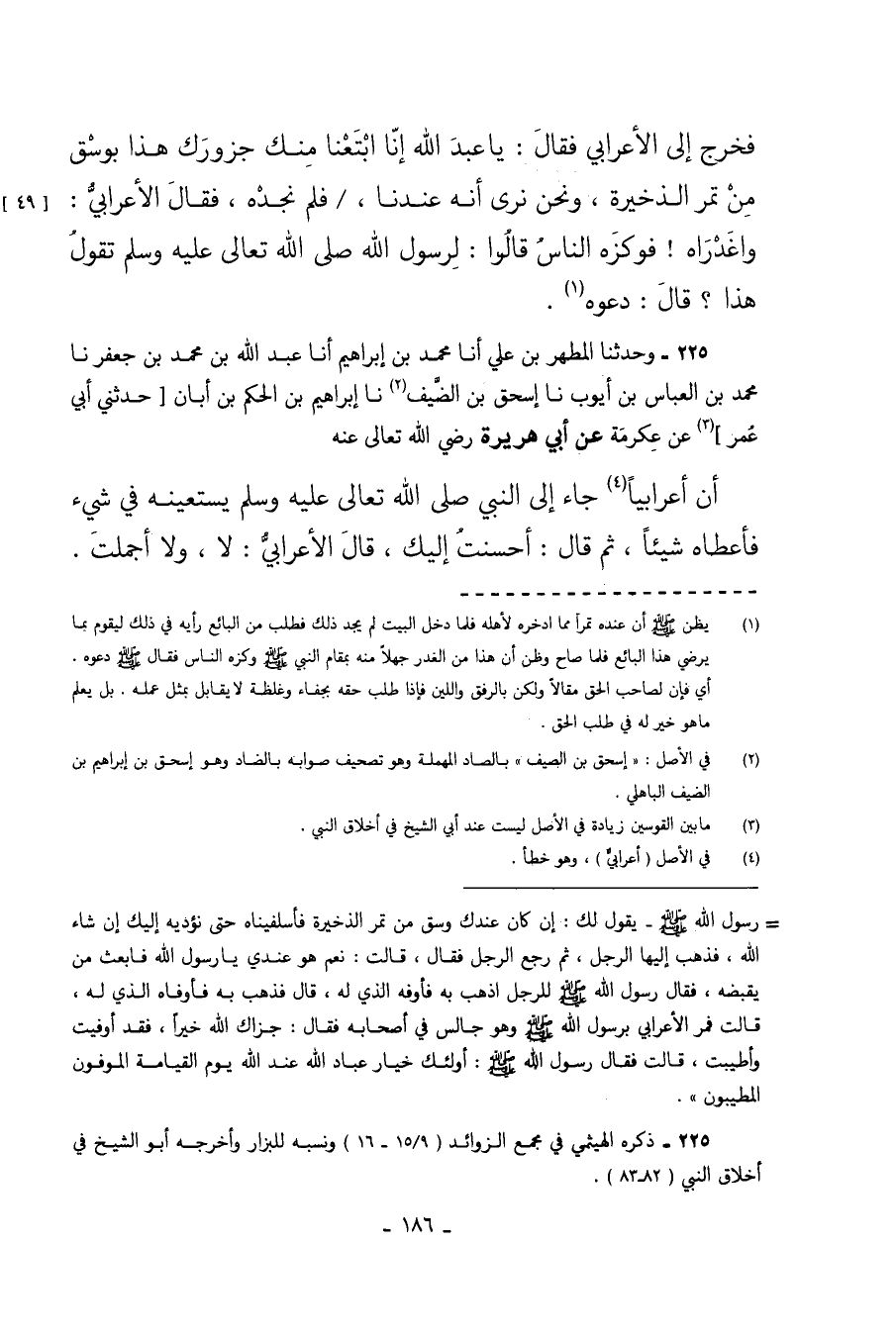 225 - وَحَدَّثَنَا الْمُطَهَّرُ بْنُ عَلِيٍّ أَنَا مُحَمَّدُ بْنُ إِبْرَاهِيمَ أَنَا عَبْدُ اللَّهِ بْنُ مُحَمَّدِ بْنِ جَعْفَرٍ نا مُحَمَّدُ بْنُ الْعَبَّاسِ بْنِ أيوب نا إسحق بْنُ الضَّيْفِ نا إِبْرَاهِيمُ بْنُ الْحَكَمِ بْنِ أَبَانٍ حدثني أبي عُمَرَ عَنْ عِكْرِمَةَ عَنْ أَبِي هُرَيْرَةَ رَضِيَ اللَّهُ تَعَالَى عَنْهُ أَنَّ أَعْرَابِيًّا جَاءَ إِلَى النَّبِيِّ صَلَّى اللَّهُ تَعَالَى عَلَيْهِ وَسَلَّمَ يَسْتَعِينُهُ فِي شَيْءٍ فَأَعْطَاهُ شَيْئًا ثُمَّ قَالَ أَحْسَنْتُ إِلَيْكَ قَالَ الأَعْرَابِيُّ لا وَلا أَجْمَلْتَ0