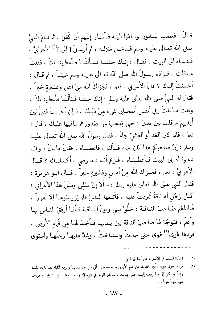 قَالَ فَغَضِبَ الْمُسْلِمُونَ وَقَامُوا إِلَيْهِ فَأَشَارَ إِلَيْهِمْ أَنْ كُفُّوا ثُمَّ قَامَ النَّبِيُّ صَلَّى اللَّهُ تَعَالَى عَلَيْهِ وَسَلَّمَ فَدَخَلَ مَنْزِلَهُ ثُمَّ أَرْسَلَ إِلَى الأَعْرَابِيِّ فَدَعَاهُ إِلَى الْبَيْتِ فَقَالَ إِنَّكَ جِئْتَنَا فَسَأَلْتَنَا فَأَعْطَيْنَاكَ فَقُلْتَ مَا قُلْتَ فَزَادَهُ رَسُولُ اللَّهِ صَلَّى اللَّهُ تَعَالَى عَلَيْهِ وَسَلَّمَ شَيْئًا ثُمَّ قَالَ أَحْسَنْتُ إِلَيْكَ قَالَ الأَعْرَابِيُّ نَعَمْ فَجَزَاكَ اللَّهُ مِنْ أَهْلٍ وَعَشِيرَةٍ خَيْرًا فَقَالَ له النَّبِيُّ صَلَّى اللَّهُ تَعَالَى عَلَيْهِ وَسَلَّمَ إِنَّكَ جِئْتَنَا فَسَأَلْتَنَا فَأَعْطَيْنَاكَ وَقُلْتَ مَا قُلْتَ وَفِي أَنْفُسِ أَصْحَابِي شَيْءٌ مِنْ ذَلِكَ فَإِنْ أَحْبَبْتَ فَقُلْ بَيْنَ أَيْدِيهِمْ مَا قُلْتَ بَيْنَ يَدَيَّ حَتَّى يَذْهَبَ مِنْ صُدُورِهِمْ مَا فِيهَا عَلَيْكَ قَالَ نَعَمْ فَلَمَّا كَانَ الْغَدُ أَوِ الْعَشِيُّ جَاءَ فَقَالَ رَسُولُ اللَّهِ صَلَّى اللَّهُ تَعَالَى عَلَيْهِ وَسَلَّمَ إِنَّ صَاحِبَكُمْ هَذَا كَانَ جَاءَ فَسَأَلَنَا فَأَعْطَيْنَاهُ فَقَالَ مَا قَالَ وَإِنَّا دَعَوْنَاهُ إِلَى الْبَيْتِ فَأَعْطَيْنَاهُ فَزَعَمَ أَنَّهُ قَدْ رَضِيَ أَكَذَلِكَ قَالَ الأَعْرَابِيُّ نَعَمْ فَجَزَاكَ اللَّهُ مِنْ أَهْلٍ وَعَشِيرَةٍ خَيْرًا قَالَ أَبُو هُرَيْرَةَ فَقَالَ النَّبِيُّ صَلَّى اللَّهُ تَعَالَى عَلَيْهِ وَسَلَّمَ أَلا إِنَّ مَثَلِي وَمَثَلَ هَذَا الأَعْرَابِيِّ كَمَثَلِ رَجُلٍ لَهُ نَاقَةٌ شَرَدَتْ عَلَيْهِ فَاتَّبَعَهَا النَّاسُ فَلَمْ يَزِيدُوهَا إِلا نُفُورًا فَنَادَاهُمْ صَاحِبُ النَّاقَةِ خَلُّوا بَيْنِي وَبَيْنَ النَّاقَةِ فَأَنَا أَرْفَقُ النَّاسِ بِهَا وَأَعْلَمُ فَتَوَجَّهَ لَهَا صَاحِبُ النَّاقَةِ بَيْنَ يَدَيْهَا فَأَخَذَ لَهَا مِنْ قُمَامِ الأرض فردها هوى هوى حَتَّى جَاءَتْ وَاسْتَنَاخَتْ وَشَدَّ عَلَيْهَا رَحْلَهَا وَاسْتَوَى