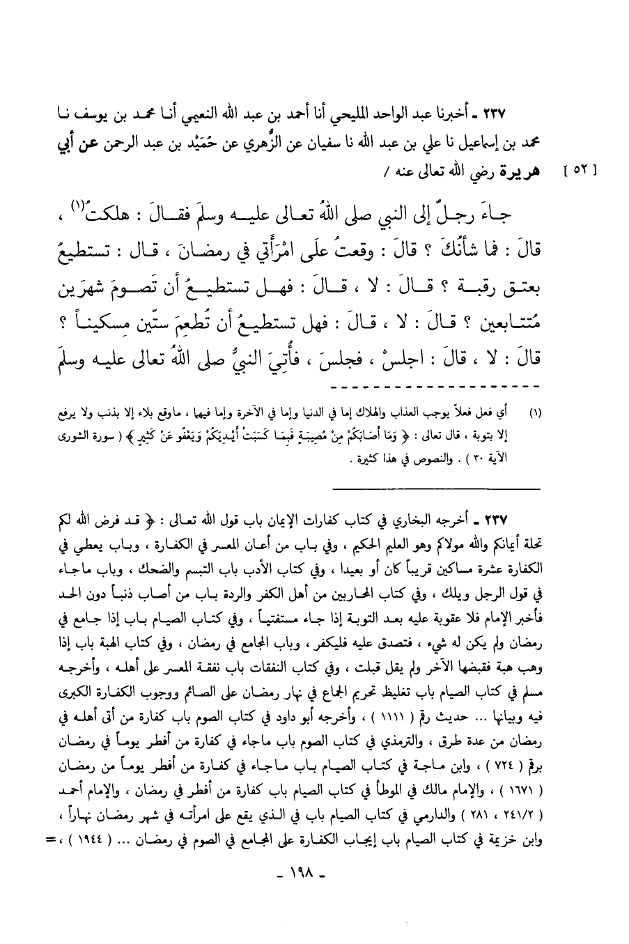 237 - أَخْبَرَنَا عَبْدُ الْوَاحِدِ الْمَلِيحِيُّ أَنَا أَحْمَدُ بْنُ عَبْدِ اللَّهِ النُّعَيْمِيُّ أَنَا مُحَمَّدُ بْنُ يُوسُفَ نا مُحَمَّدُ بْنُ إِسْمَاعِيلَ نا عَلِيُّ بْنُ عَبْدِ اللَّهِ نا سُفْيَانُ عَنِ الزُّهْرِيِّ عَنْ حُمَيْدِ بْنِ عَبْدِ الرَّحْمَنِ عَنْ أَبِي هُرَيْرَةَ رَضِيَ اللَّهُ تَعَالَى عَنْهُ جَاءَ رَجُلٌ إِلَى النَّبِيِّ صَلَّى اللَّهُ تَعَالَى عَلَيْهِ وَسَلَّمَ فَقَالَ هَلَكْتُ قَالَ فَمَا شَأْنُكَ قَالَ وَقَعْتُ عَلَى امْرَأَتِي فِي رَمَضَانَ قَالَ تَسْتَطِيعُ بِعِتْقِ رَقَبَةٍ قَالَ لا قَالَ فَهَلْ تَسْتَطِيعُ أَنْ تَصُومَ شَهْرَيْنِ مَتَتَابِعَيْنِ قَالَ لا قَالَ فَهَلْ تَسْتَطِيعُ أَنْ تُطْعِمَ سِتِّينَ مِسْكِينًا قَالَ لا قَالَ اجْلِسْ فَجَلَسَ فَأُتِيَ النَّبِيُّ صَلَّى اللَّهُ تَعَالَى عَلَيْهِ وَسَلَّمَ