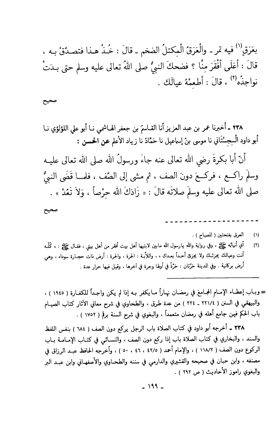238 - أَخْبَرَنَا عُمَرُ بْنُ عَبْدِ الْعَزِيزِ أَنَا الْقَاسِمُ بْنُ جَعْفَرٍ الْهَاشِمِيُّ نا أَبُو عَلِيٍّ اللُّؤْلُؤِيُّ نا أَبُو دَاوُدَ السِّجِسْتَانِيُّ نا مُوسَى بْنُ إِسْمَاعِيلَ نا حَمَّادٌ نا زِيَادٌ الأَعْلَمُ عَنِ الْحَسَنِ أَنَّ أَبَا بَكْرَةَ رَضِيَ اللَّهُ تَعَالَى عَنْهُ جَاءَ وَرَسُولُ اللَّهِ صَلَّى اللَّهُ تَعَالَى عَلَيْهِ وَسَلَّمَ رَاكِعٌ فَرَكَعَ دُونَ الصَّفِّ ثُمَّ مَشَى إِلَى الصَّفِّ فَلَمَّا قَضَى النَّبِيُّ صَلَّى اللَّهُ تَعَالَى عَلَيْهِ وَسَلَّمَ صَلاتَهُ قَالَ زَادَكَ اللَّهُ حِرْصًا ولا تعد. صحيح