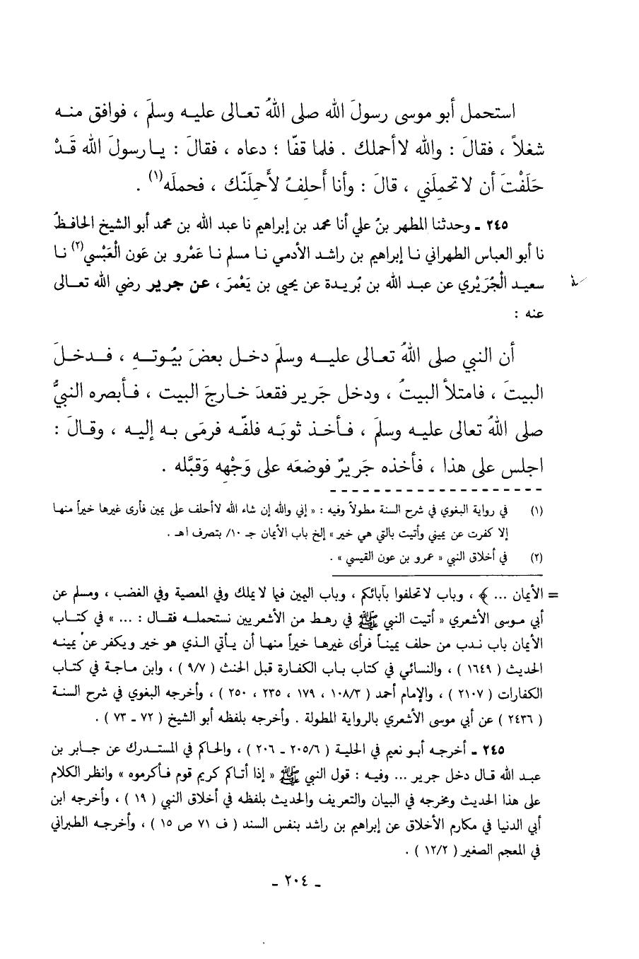 245 - وَحَدَّثَنَا الْمُطَهَّرُ بْنُ عَلِيٍّ أَنَا مُحَمَّدُ بْنُ إِبْرَاهِيمَ نا عَبْدُ اللَّهِ بْنُ مُحَمَّدٍ أَبُو الشَّيْخِ الْحَافِظُ نا أَبُو الْعَبَّاسِ الطِّهْرَانِيُّ نا إِبْرَاهِيمُ بْنُ رَاشِدٍ الأَدَمِيُّ نا مُسْلِمٌ نا عَمْرُو بْنُ عَوْنٍ الْعَبْسِيُّ نا سَعِيدٌ الْجُرَيْرِيُّ عَنْ عَبْدِ اللَّهِ بْنِ بُرَيْدَةَ عَنْ يَحْيَى بْنِ يَعْمَرَ عَنْ جَرِيرٍ رَضِيَ اللَّهُ تَعَالَى عَنْهُ أَنَّ النَّبِيَّ صَلَّى اللَّهُ تَعَالَى عَلَيْهِ وَسَلَّمَ دَخَلَ بَعْضَ بُيُوتِهِ فَدَخَلَ الْبَيْتَ فَامْتَلا الْبَيْتُ وَدَخَلَ جَرِيرٌ فَقَعَدَ خَارِجَ الْبَيْتِ فَأَبْصَرَهُ النَّبِيُّ صَلَّى اللَّهُ تَعَالَى عَلَيْهِ وَسَلَّمَ فَأَخَذَ ثَوْبَهُ فَلَفَّهُ فَرَمَى بِهِ إِلَيْهِ وَقَالَ اجْلِسْ عَلَى هَذَا فَأَخَذَهُ جَرِيرٌ فَوَضَعَهُ عَلَى وَجْهِهِ وَقَبَّلَهُ.