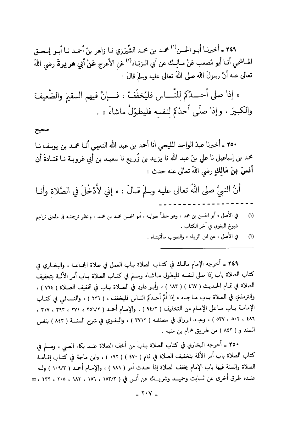 249 - أَخْبَرَنَا أَبُو الْحَسَنِ مُحَمَّدُ بْنُ مُحَمَّدٍ الشِّيرَزِيُّ نا زَاهِرُ بْنُ أَحْمَدَ نا أبو إسحق الْهَاشِمِيُّ أَنَا أَبُو مُصْعَبٍ عَنْ مَالِكٍ عَنْ أَبِي الزِّنَادِ عَنِ الأَعْرَجِ عَنْ أَبِي هُرَيْرَةَ رَضِيَ اللَّهُ تَعَالَى عَنْهُ أَنَّ رَسُولَ اللَّهِ صَلَّى اللَّهُ تَعَالَى عَلَيْهِ وَسَلَّمَ قَالَ إِذَا صَلَّى أَحَدُكُمْ لِلنَّاسِ فَلْيُخَفِّفْ فَإِنَّ فِيهِمُ السَّقِيمَ وَالضَّعِيفَ وَالْكَبِيرَ وَإِذَا صَلَّى أَحَدُكُمْ لِنَفْسِهِ فَلْيُطَوِّلْ ما شاء. صحيح