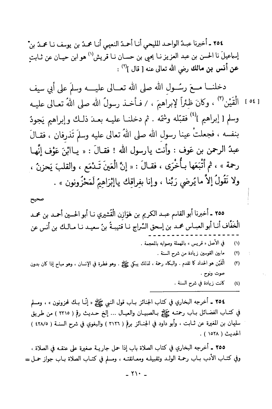 254 - أَخْبَرَنَا عَبْدُ الْوَاحِدِ الْمَلِيحِيُّ أَنَا أَحْمَدُ النُّعَيْمِيُّ أَنَا مُحَمَّدُ بْنُ يُوسُفَ نا مُحَمَّدُ بْنُ إِسْمَاعِيلَ نا الْحَسَنُ بْنُ عَبْدِ الْعَزِيزِ نا يَحْيَى بْنُ حَسَّانٍ نا قُرَيْشٌ هُوَ ابْنُ حَيَّانَ عَنْ ثِابِتٍ عَنْ أَنَسِ بْنِ مَالِكٍ رَضِيَ اللَّهُ تَعَالَى عَنْهُ قَالَ دَخَلْنَا مَعَ رَسُولِ اللَّهِ صَلَّى اللَّهُ تَعَالَى عَلَيْهِ وَسَلَّمَ عَلَى أَبِي سَيْفٍ الْقَيْنِ وَكَانَ ظِئْرًا لإِبْرَاهِيمَ فَأَخَذَ رَسُولُ اللَّهِ صَلَّى اللَّهُ تَعَالَى عَلَيْهِ وَسَلَّمَ فَقَبَّلَهُ وَشَمَّهُ ثُمَّ دَخَلْنَا عَلَيْهِ بَعْدَ ذَلِكَ وَإِبْرَاهِيمُ يَجُودُ بِنَفْسِهِ فَجَعَلَتْ عَيْنَا رَسُولِ اللَّهِ صَلَّى اللَّهُ تَعَالَى عَلَيْهِ وَسَلَّمَ تَذْرِفَانِ فَقَالَ عَبْدُ الرَّحْمَن بْنُ عَوْفٍ وَأَنْتَ يَا رَسُولَ الله فقال يا ابن عَوْفٍ إِنَّهَا رَحْمَةٌ ثُمَّ أَتْبَعَهَا بِأُخْرَى فَقَالَ إِنَّ الْعَيْنَ تَدْمَعُ وَالْقَلْبَ يَحْزَنُ وَلا نَقُولُ إِلا مَا يُرْضِي رَبَّنَا وَإِنَّا بِفِرَاقِكَ يَا إبراهيم لمحزونون. صحيح
