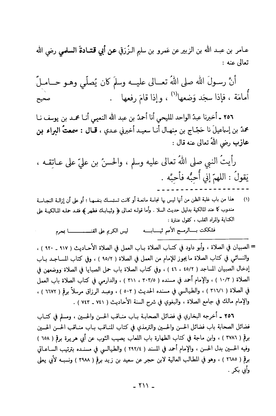 عَامِرِ بْنِ عَبْدِ اللَّهِ بْنِ الزُّبَيْرِ عَنْ عَمْرِو بْنِ سُلَيْمٍ الزَّرْقِيِّ عَنْ أَبِي قَتَادَة السَّلَمِيِّ رَضِيَ اللَّهُ تَعَالَى عَنْهُ أَنَّ رَسُولَ اللَّهِ صَلَّى اللَّهُ تَعَالَى عَلَيْهِ وَسَلَّمَ كَانَ يُصَلِّي وَهُوَ حَامِلٌ أُمَامَةَ فَإِذَا سَجَدَ وَضَعَهَا وَإِذَا قام رفعها. صحيح