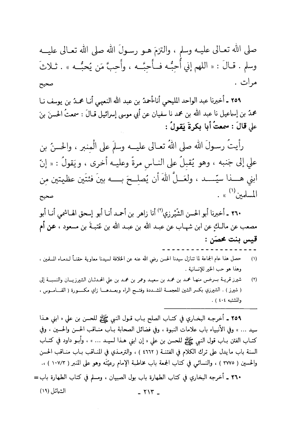 259 - أَخْبَرَنَا عَبْدُ الْوَاحِدِ الْمَلِيحِيُّ أَنَا أَحْمَدُ بْنُ عبد الله النعيمي أنا محمد بن يُوسُفَ نا مُحَمَّدُ بْنُ إِسْمَاعِيلَ نا عَبْدُ اللَّهِ بْنُ مُحَمَّدٍ نا سُفْيَانُ عَنْ أَبِي مُوسَى إِسْرَائِيلَ قَالَ سمعت الحسن بن علي قَالَ سَمِعْتُ أَبَا بَكْرَةَ يَقُولُ رَأَيْتُ رَسُولَ اللَّهِ صَلَّى اللَّهُ تَعَالَى عَلَيْهِ وَسَلَّمَ عَلَى الْمِنْبَرِ وَالْحَسَنُ بْنُ عَلِيٍّ إِلَى جَنْبِهِ وَهُوَ يُقْبِلُ عَلَى النَّاسِ مَرَّةً وَعَلَيْهِ أُخْرَى وَيَقُولُ إِنَّ ابْنِي هَذَا سَيِّدٌ وَلَعَلَّ الله أن يصلح به فئتين عَظِيمَتَيْنِ من المسلمين. صحيح