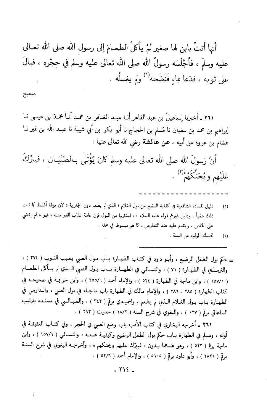 261 - أَخْبَرَنَا إِسْمَاعِيلُ بْنُ عَبْدِ الْقَاهِرِ أَنَا عَبْدُ الْغَافِرِ بْنُ مُحَمَّدٍ أَنَا مُحَمَّدُ بْنُ عِيسَى نا إِبْرَاهِيمُ بْنُ مُحَمَّدِ بْنِ سُفْيَانَ نا مُسْلِمُ بْنُ الْحَجَّاجِ نا أَبُو بَكْرِ بْنُ أَبِي شَيْبَةَ نا عَبْدُ اللَّهِ بْنُ نُمَيْرٍ نا هِشَامُ بْنُ عُرْوَةَ عَنْ أَبِيهِ عَنْ عَائِشَةَ رَضِيَ اللَّهُ تَعَالَى عَنْهَا أَنَّ رَسُولَ اللَّهِ صَلَّى اللَّهُ تَعَالَى عَلَيْهِ وَسَلَّمَ كَانَ يُؤْتَى بِالصِّبْيَانِ فَيُبَرِّكُ عَلَيْهِمْ وَيُحَنِّكُهُمْ.