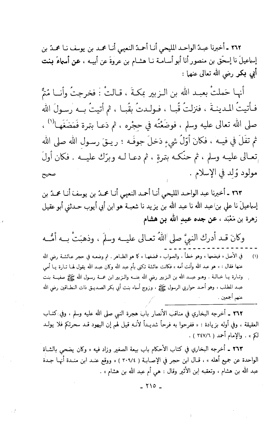 262 - أَخْبَرَنَا عَبْدُ الْوَاحِدِ الْمَلِيحِيُّ أَنَا أَحْمَدُ النُّعَيْمِيُّ أَنَا مُحَمَّدُ بْنُ يُوسُفَ نا مُحَمَّدُ بْنُ إسماعيل نا إسحق بْنُ مَنْصُورٍ أَنَا أَبُو أُسَامَةَ نا هِشَامُ بْنُ عُرْوَةَ عَنْ أَبِيهِ عَنْ أَسْمَاءَ بِنْتِ أَبِي بَكْرٍ رَضِيَ اللَّهُ تَعَالَى عَنْهُمَا أَنَّهَا حَمَلَتْ بِعَبْدِ اللَّهِ بْنِ الزُّبَيْرِ بِمَكَّةَ قَالَتْ فَخَرَجْتُ وَأَنَا مُتِمٌّ فَأَتَيْتُ الْمَدِينَةَ فَنَزَلْتُ قُبَا فَوَلَدْتُ بِقُبَا ثُمَّ أَتَيْتُ بِهِ رَسُولَ اللَّهِ صَلَّى اللَّهُ تَعَالَى عَلَيْهِ وَسَلَّمَ فَوَضَعْتُهُ فِي حِجْرِهِ ثُمَّ دَعَا بِتَمْرَةٍ فَمَضَغَهَا ثُمَّ تَفَلَ فِي فِيهِ فَكَانَ أَوَّلُ شَيْءٍ دَخَلَ جَوْفَهُ رِيقَ رَسُولِ اللَّهِ صَلَّى اللَّهُ تَعَالَى عَلَيْهِ وَسَلَّمَ ثُمَّ حَنَّكَهُ بِتَمْرَةٍ ثُمَّ دَعَا لَهُ وَبَرَّكَ عَلَيْهِ فَكَانَ أَوَّلَ مَوْلُودٍ وُلِدَ في الإسلام. صحيح