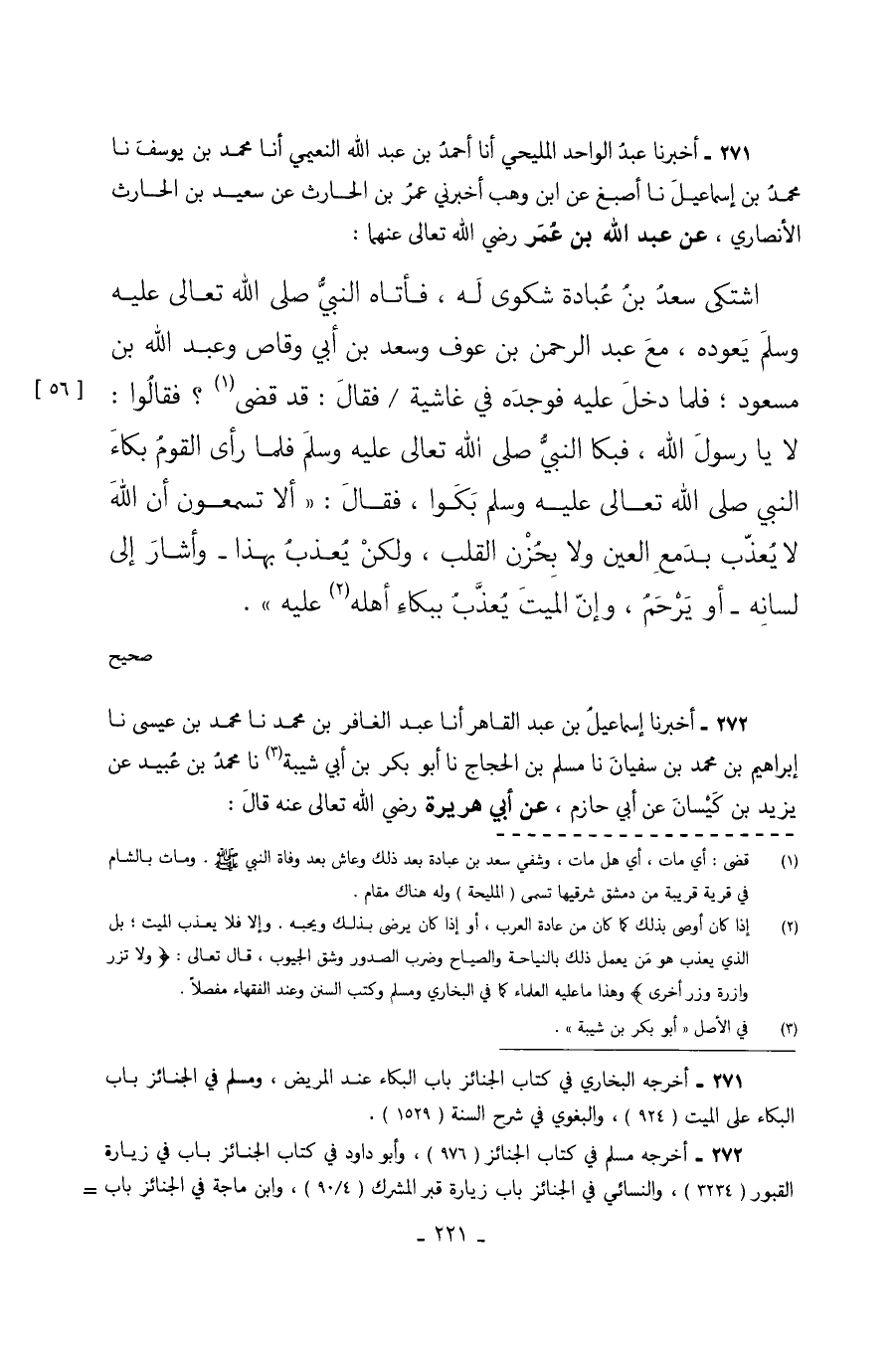 271 - أَخْبَرَنَا عَبْدُ الْوَاحِدِ الْمَلِيحِيُّ أَنَا أَحْمَدُ بْنُ عَبْدِ اللَّهِ النُّعَيْمِيُّ أَنَا مُحَمَّدُ بْنُ يُوسُفَ نا مُحَمَّدُ بْنُ إِسْمَاعِيلَ نا أَصْبَغُ عَنِ ابْنِ وَهْبٍ أَخْبَرَنِي عُمَرُ بْنُ الْحَارِثِ عَنْ سَعِيدِ بْنِ الْحَارِثِ الأَنْصَارِيِّ عَنْ عَبْدِ اللَّهِ بْنِ عُمَرَ رَضِيَ اللَّهُ تَعَالَى عَنْهُمَا اشْتَكَى سَعْدُ بْنُ عُبَادَةَ شَكْوَى لَهُ فَأَتَاهُ النَّبِيُّ صَلَّى اللَّهُ تَعَالَى عَلَيْهِ وَسَلَّمَ يَعُودُهُ مَعَ عَبْدِ الرَّحْمَنِ بْنِ عَوْفٍ وَسَعْدِ بْنِ أَبِي وَقَّاصٍ وَعَبْدِ اللَّهِ بْنِ مَسْعُودٍ فَلَمَّا دَخَلَ عَلَيْهِ فَوَجَدَهُ فِي غَاشِيَةٍ فَقَالَ قَدْ قَضَى فَقَالُوا لا يَا رسول الله فبكا النَّبِيُّ صَلَّى اللَّهُ تَعَالَى عَلَيْهِ وَسَلَّمَ فَلَمَّا رَأَى الْقَوْمُ بُكَاءَ النَّبِيِّ صَلَّى اللَّهُ تَعَالَى عَلَيْهِ وَسَلَّمَ بَكَوْا فَقَالَ أَلا تَسْمَعُونَ أَنَّ اللَّهَ لا يُعَذِّبُ بِدَمْعِ الْعَيْنِ وَلا بِحُزْنِ الْقَلْبِ وَلَكِنْ يُعَذِّبُ بِهَذَا وَأَشَارَ إِلَى لِسَانِهِ أَوْ يَرْحَمُ وَإِنَّ الْمَيِّتَ يُعَذَّبُ بِبُكَاءِ أهله عليه. صحيح