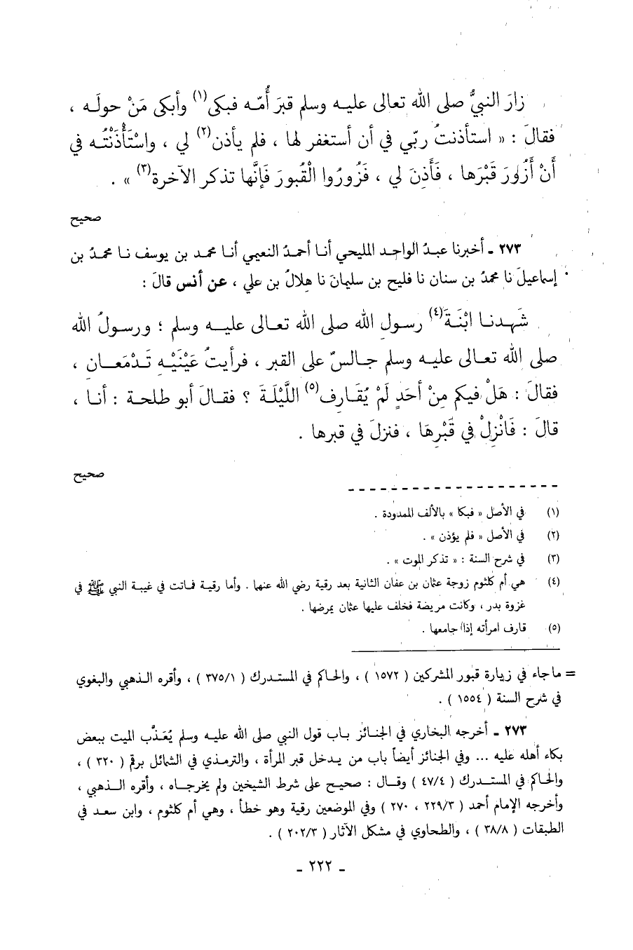 273 - أَخْبَرَنَا عَبْدُ الْوَاحِدِ الْمَلِيحِيُّ أَنَا أَحْمَدُ النُّعَيْمِيُّ أَنَا مُحَمَّدُ بْنُ يُوسُفَ نا مُحَمَّدُ بْنُ إِسْمَاعِيلَ نا مُحَمَّدُ بْنُ سِنَانٍ نا فُلَيْحُ بْنُ سُلَيْمَانَ نا هِلالُ بْنُ عَلِيٍّ عَنْ أَنَسٍ قَالَ شَهِدْنَا ابْنَةَ رَسُولِ اللَّهِ صَلَّى اللَّهُ تَعَالَى عَلَيْهِ وَسَلَّمَ وَرَسُولُ اللَّهِ صَلَّى اللَّهُ تَعَالَى عَلَيْهِ وَسَلَّمَ جَالِسٌ عَلَى الْقَبْرِ فَرَأَيْتُ عَيْنَيْهِ تَدْمَعَانِ فَقَالَ هَلْ فِيكُمْ مِنْ أَحَدٍ لَمْ يُقَارِفِ اللَّيْلَةَ فَقَالَ أَبُو طَلْحَةَ أَنَا قَالَ فَانْزِلْ فِي قَبْرِهَا فَنَزَلَ في قبرها. صحيح