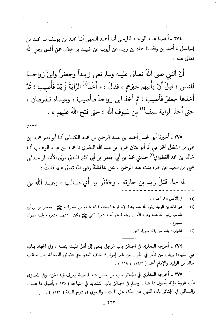 274 - أَخْبَرَنَا عَبْدُ الْوَاحِدِ الْمَلِيحِيُّ أَنَا أَحْمَدُ النُّعَيْمِيُّ أَنَا مُحَمَّدُ بْنُ يُوسُفَ نا مُحَمَّدُ بْنُ إِسْمَاعِيلَ نا أَحْمَدُ بْنُ وَاقِدٍ نا حَمَّادُ بْنُ زَيْدٍ عَنْ أيوب عن عبيد بْنِ هِلالٍ عَنْ أَنَسٍ رَضِيَ اللَّهُ تَعَالَى عَنْهُ أَنَّ النَّبِيَّ صَلَّى اللَّهُ تَعَالَى عَلَيْهِ وَسَلَّمَ نَعَى زَيْدًا وَجَعْفَرًا وَابْنَ رَوَاحَةَ لِلنَّاسِ قَبْلَ أَنْ يَأْتِيَهُمْ خَبَرُهُمْ فَقَالَ أَخَذَ الرَّايَةَ زَيْدٌ فَأُصِيبَ ثُمَّ أَخَذَهَا جَعْفَرٌ فَأُصِيبَ ثُمَّ أَخَذَ ابْنُ رَوَاحَةَ فَأُصِيبَ وَعَيْنَاهُ تَذْرِفَانِ حَتَّى أَخَذَ الرَّايَةَ سَيْفٌ مِنْ سُيُوفِ اللَّهِ حَتَّى فَتَحَ الله عليهم. صحيح