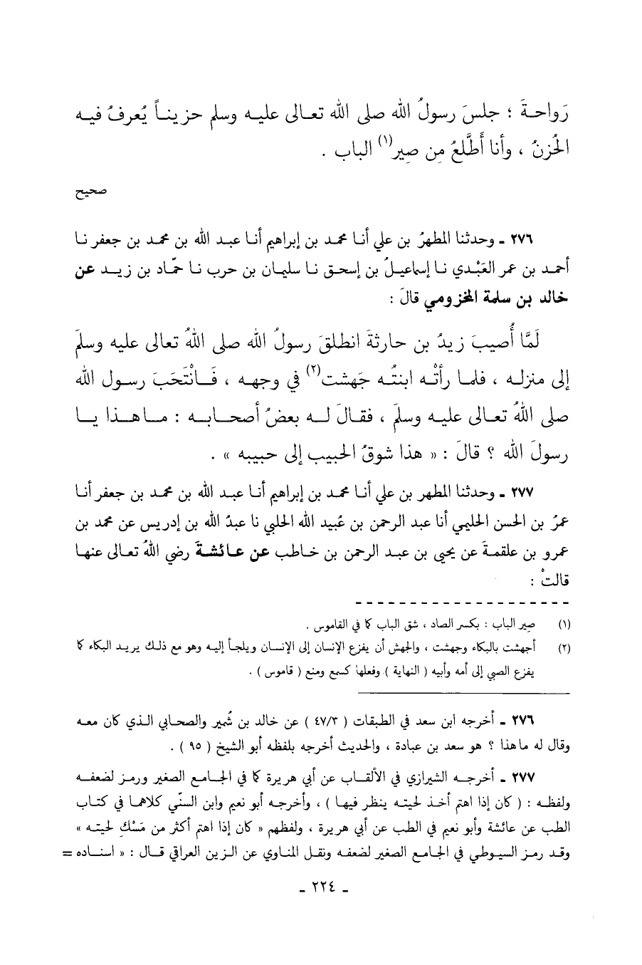 276 - وَحَدَّثَنَا الْمُطَهَّرُ بْنُ عَلِيٍّ أَنَا مُحَمَّدُ بْنُ إِبْرَاهِيمَ أَنَا عَبْدُ اللَّهِ بْنُ مُحَمَّدِ بْنِ جَعْفَرٍ نا أَحْمَدُ بْنُ عُمَرَ الْعَبْدِيُّ نا إسماعيل بن إسحق نا سُلَيْمَانُ بْنُ حَرْبٍ نا حَمَّادُ بْنُ زَيْدٍ عَنْ خَالِدِ بْنِ سَلَمَةَ الْمَخْزُومِيِّ قَالَ لَمَّا أُصِيبَ زَيْدُ بْنُ حَارِثَةَ انْطَلَقَ رَسُولُ اللَّهِ صَلَّى اللَّهُ تَعَالَى عَلَيْهِ وَسَلَّمَ إِلَى مَنْزِلِهِ فَلَمَّا رَأَتْهُ ابْنَتُهُ جَهِشَتْ فِي وَجْهِهِ فَانْتَحَبَ رَسُولُ اللَّهِ صَلَّى اللَّهُ تَعَالَى عليه وسلم قال هَذَا شَوْقُ الْحَبِيبِ إِلَى حَبِيبِهِ.
