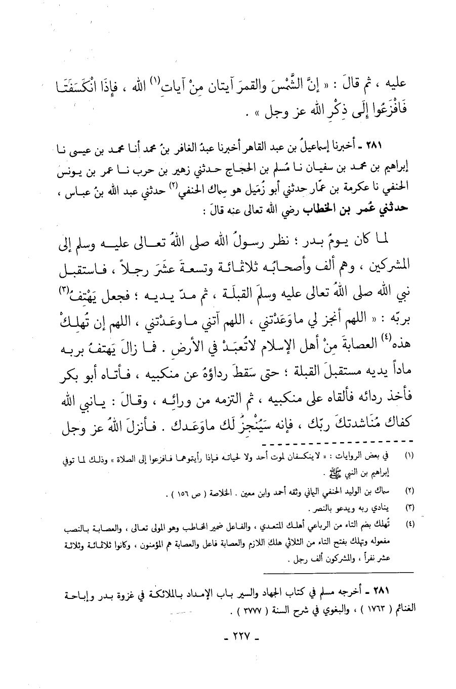 281 - أَخْبَرَنَا إِسْمَاعِيلُ بْنُ عَبْدِ الْقَاهِرِ أَخْبَرَنَا عَبْدُ الْغَافِرِ بْنُ مُحَمَّدٍ أَنَا مُحَمَّدُ بْنُ عِيسَى نا إِبْرَاهِيمُ بْنُ مُحَمَّدِ بْنِ سُفْيَانَ نا مُسْلِمُ بْنُ الْحَجَّاجِ حَدَّثَنِي زُهَيْرُ بْنُ حَرْبٍ نا عُمَرُ بْنُ يُونُسَ الْحَنَفِيُّ نا عِكْرِمَةُ بْنُ عَمَّارٍ حَدَّثَنِي أَبُو زُمَيْلٍ هُوَ سِمَاكٌ الْحَنَفِيُّ حَدَّثَنِي عَبْدُ اللَّهِ بْنُ عَبَّاسٍ حَدَّثَنِي عُمَرُ بْنُ الْخَطَّابِ رَضِيَ اللَّهُ تَعَالَى عَنْهُ قَالَ لَمَّا كَانَ يَوْمُ بَدْرٍ نَظَرَ رَسُولُ اللَّهِ صَلَّى اللَّهُ تَعَالَى عَلَيْهِ وَسَلَّمَ إِلَى الْمُشْرِكِينَ وَهُمْ ألف وأصحابه ثلاثمائة وَتِسْعَةَ عَشَرَ رَجُلا فَاسْتَقْبَلَ نَبِيُّ اللَّهِ صَلَّى اللَّهُ تَعَالَى عَلَيْهِ وَسَلَّمَ الْقِبْلَةَ ثُمَّ مَدَّ يَدَيْهِ فَجَعَلَ يَهْتِفُ بِرَبِّهِ اللَّهُمَّ أَنْجِزْ لِي مَا وَعَدْتَنِي اللَّهُمَّ آتِنِي مَا وَعَدْتَنِي اللَّهُمَّ إِنْ تُهْلِكْ هَذِهِ الْعِصَابَةَ مِنْ أَهْلِ الإِسْلامِ لا تُعْبَدْ فِي الأَرْضِ فَمَا زَالَ يَهْتِفُ بِرَبِّهِ مَادًّا يَدَيْهِ مُسْتَقْبِلَ الْقِبْلَةِ حَتَّى سَقَطَ رِدَاؤُهُ عَنْ مَنْكِبَيْهِ فَأَتَاهُ أَبُو بكر فأخذ ردائه فَأَلْقَاهُ عَلَى مَنْكِبَيْهِ ثُمَّ الْتَزَمَهُ مِنْ وَرَائِهِ وَقَالَ يَا نَبِيَّ اللَّهِ كَفَاكَ مُنَاشَدَتُكَ رَبَّكَ فَإِنَّهُ سَيُنْجِزُ لَكَ مَا وَعَدَكَ فَأَنْزَلَ اللَّهُ عَزَّ وَجَلَّ