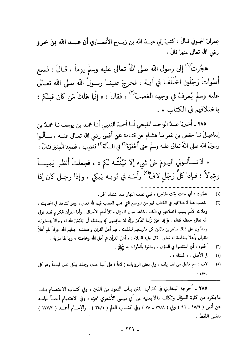 عِمْرَانَ الْجَوْنِيُّ قَالَ كَتَبَ إِلَيَّ عَبْدُ اللَّهِ بْنُ رَبَاحٍ الأَنْصَارِيُّ أَنَّ عَبْدَ اللَّهِ بْنَ عَمْرٍو رَضِيَ اللَّهُ تَعَالَى عَنْهُمَا قَالَ هَجَّرْتُ إِلَى رَسُولِ اللَّهِ صَلَّى اللَّهُ تَعَالَى عَلَيْهِ وَسَلَّمَ يَوْمًا قَالَ فَسَمِعَ أَصْوَاتَ رَجُلَيْنِ اخْتَلَفَا فِي آيَةٍ فَخَرَجَ عَلَيْنَا رَسُولُ اللَّهِ صَلَّى اللَّهُ تَعَالَى عَلَيْهِ وَسَلَّمَ يُعْرَفُ فِي وَجْهِهِ الْغَضَبُ فَقَالَ إِنَّمَا هَلَكَ مَنْ كَانَ قَبْلَكُمْ بِاخْتِلافِهِمْ فِي الْكِتَابِ.