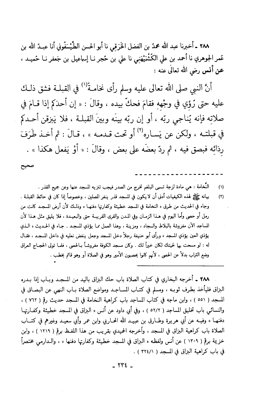 288 - أَخْبَرَنَا عَبْدُ اللَّهِ مُحَمَّدِ بْنِ الْفَضْلِ الْخَرَقِيُّ نا أَبُو الْحَسَنِ الطَّيْسَفُونِيُّ أَنَا عَبْدُ اللَّهِ بْنُ عُمَرَ الْجَوْهَرِيُّ نا أَحْمَدُ بْنُ عَلِيٍّ الْكُشْمِيهَنِيُّ نا عَلِيُّ بْنُ حُجْرٍ نا إِسْمَاعِيلُ بْنُ جَعْفَرٍ نا حُمَيْدٌ عَنْ أَنَسٍ رَضِيَ اللَّهُ تَعَالَى عَنْهُ أَنَّ النَّبِيَّ صَلَّى اللَّهُ تَعَالَى عَلَيْهِ وَسَلَّمَ رَأَى نُخَامَةً فِي الْقِبْلَةِ فَشَقَّ ذَلِكَ عَلَيْهِ حَتَّى رُؤِيَ فِي وَجْهِهِ فَقَامَ فَحَكَّ بِيَدِهِ وَقَالَ إِنَّ أَحَدَكُمْ إِذَا قَامَ فِي صَلاتِهِ فَإِنَّهُ يُنَاجِي رَبَّهُ أَوْ إِنَّ رَبَّهُ بَيْنَهُ وَبَيْنَ الْقِبْلَةِ فَلا يَبْزُقَنَّ أَحَدُكُمْ فِي قِبْلَتِهِ وَلَكِنْ عَنْ يَسَارِهِ أَوْ تَحْتَ قَدَمِهِ قَالَ ثُمَّ أَخَذَ طَرْفَ رِدَائِهِ فَبَصَقَ فِيهِ ثُمَّ رَدَّ بَعْضَهُ عَلَى بَعْضٍ وَقَالَ أَوْ يفعل هكذا. صحيح