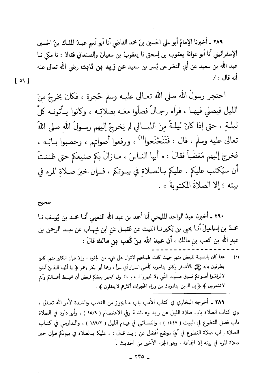 289 - أَخْبَرَنَا الإِمَامُ أَبُو عَلِيٍّ الْحُسَيْنُ بْنُ مُحَمَّدٍ الْقَاضِي أَنَا أَبُو نُعَيْمٍ عَبْدُ الْمَلِكِ بْنُ الْحُسَيْنِ الإِسْفَرَائِينِيُّ أَنَا أَبُو عَوَانَةَ يعقوب بن إسحق نا يَعْقُوبُ بْنُ سُفْيَانَ وَالصَّنْعَانِيُّ فَقَالا نا مَكِّيٌّ نا عَبْدُ اللَّهِ بْنُ سَعِيدٍ عَنْ أَبِي النَّضْرِ عَنْ بُسْرِ بْنِ سَعِيدٍ عَنْ زَيْدِ بْنِ ثَابِتٍ رَضِيَ اللَّهُ تَعَالَى عَنْهُ أَنَّهُ قَالَ احْتَجَرَ رَسُولُ اللَّهِ صَلَّى اللَّهُ تَعَالَى عَلَيْهِ وَسَلَّمَ حُجْرَةً فَكَانَ يَخْرُجُ مِنَ اللَّيْلِ فَيُصَلِّي فِيهَا فَرَآهُ رِجَالٌ فَصَلَّوْا مَعَهُ بِصَلاتِهِ وَكَانُوا يَأْتُونَهُ كُلَّ لَيْلَةٍ حَتَّى إِذَا كَانَ لَيْلَةً مِنَ اللَّيَالِي لَمْ يَخْرُجْ إِلَيْهِمْ رَسُولُ اللَّهِ صَلَّى اللَّهُ تَعَالَى عَلَيْهِ وَسَلَّمَ قَالَ فَتَنَحْنَحُوا وَرَفَعُوا أَصْوَاتَهُمْ وَحَصَبُوا بَابَهُ فَخَرَجَ إِلَيْهِمْ مُغْضِبًا فَقَالَ أَيُّهَا النَّاسُ مَا زَالَ بِكُمْ صَنِيعُكُمْ حَتَّى ظَنَنْتُ أَنْ سُيْكَتَبْ عَلَيْكُمْ عَلَيْكُمْ بِالصَّلاةِ فِي بُيُوتِكُمْ فَإِنَّ خَيْرَ صَلاةِ الْمَرْءِ فِي بَيْتِهِ إِلا الصلاة المكتوبة. صحيح