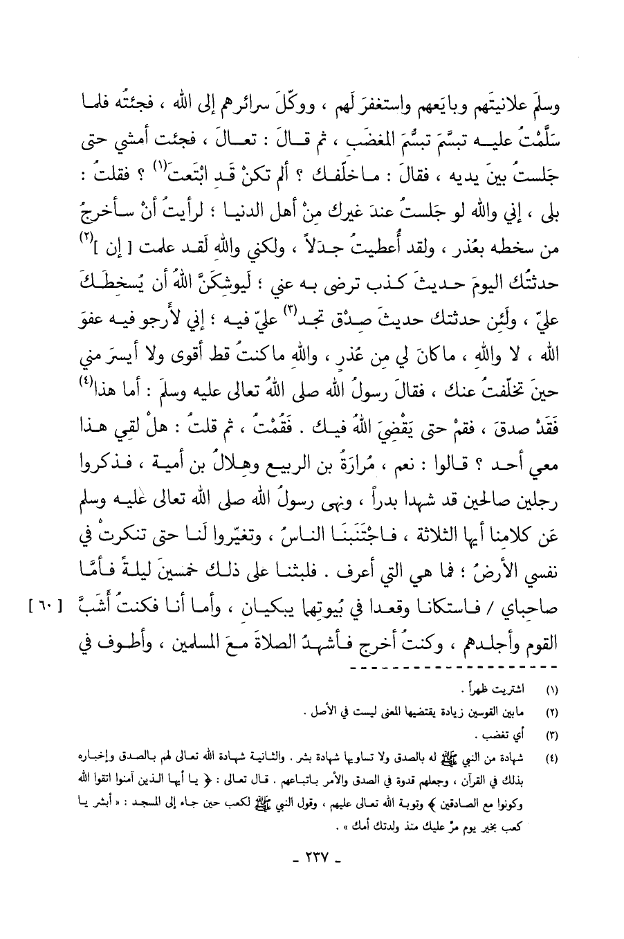 وَسَلَّمَ عَلانِيَتَهُمْ وَبَايَعَهُمْ وَاسْتَغْفَرَ لَهُمْ وَوَكَّلَ سَرَائِرَهُمْ إِلَى اللَّهِ فَجِئْتُهُ فَلَمَّا سَلَّمْتُ عَلَيْهِ تَبَسَّمَ تَبَسُّمَ الْمُغْضَبِ ثُمَّ قَالَ تَعَالَ فَجِئْتُ أَمْشِي حَتَّى جَلَسْتُ بَيْنَ يَدَيْهِ فَقَالَ مَا خَلَّفَكَ أَلَمْ تَكُنْ قَدِ ابْتَعْتَ فَقُلْتُ بَلَى إِنِّي وَاللَّهِ لَوْ جَلَسْتُ عِنْدَ غَيْرِكَ مِنْ أَهْلِ الدُّنْيَا لَرَأَيْتُ أَنْ سَأَخْرُجَ مِنْ سَخَطِهِ بِعُذْرٍ وَلَقَدْ أُعْطِيتُ جَدَلا وَلَكِنِّي وَاللَّهِ لَقَدْ عَلِمْتُ إِنْ حَدَّثْتُكَ الْيَوْمَ حَدِيثَ كَذِبٍ تَرْضَى بِهِ عَنِّي لَيُوشِكَنَّ اللَّهُ أَنْ يُسَخِّطَكَ عَلَيَّ وَلَئِنْ حَدَّثْتُكَ حَدِيثَ صِدْقٍ تَجِدُ عَلَيَّ فِيهِ إِنِّي لأَرْجُو فِيهِ عَفْوَ اللَّهِ لا وَاللَّهِ مَا كَانَ لِي مِنْ عُذْرٍ وَاللَّهِ مَا كُنْتُ قَطُّ أَقْوَى وَلا أَيْسَرَ مِنِّي حِينَ تَخَلَّفْتُ عَنْكَ فَقَالَ رَسُول اللَّهِ صَلَّى اللَّهُ تَعَالَى عَلَيْهِ وَسَلَّمَ أَمَّا هَذَا فَقَدْ صَدَقَ فَقُمْ حَتَّى يَقْضِيَ اللَّهُ فِيكَ فَقُمْتُ ثُمَّ قُلْتُ هَلْ لَقِيَ هَذَا مَعِي أَحَدٌ قَالُوا نَعَمْ مُرَارَةُ بْنُ الرَّبِيعِ وَهِلالُ بْنُ أُمَيَّةَ فَذَكَرُوا رَجُلَيْنِ صَالِحَيْنِ قَدْ شَهِدَا بَدْرًا وَنَهَى رَسُولُ اللَّهِ صَلَّى اللَّهُ