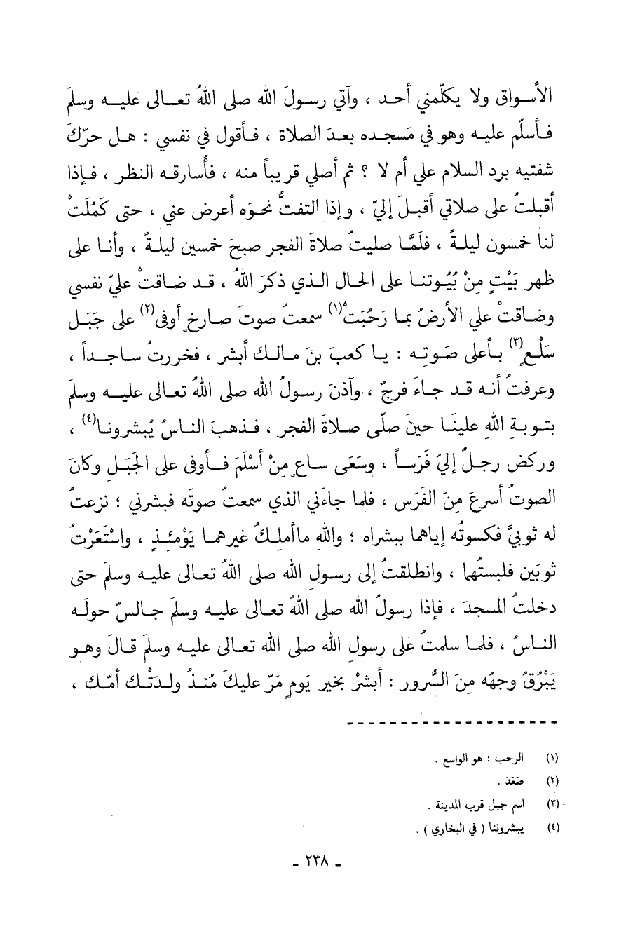 الأَسْوَاقِ وَلا يُكَلِّمُنِي أَحَدٌ وَآتِي رَسُولَ اللَّهِ صَلَّى اللَّهُ تَعَالَى عَلَيْهِ وَسَلَّمَ فَأُسَلِّمُ عَلَيْهِ وَهُوَ فِي مَسْجِدِهِ بَعْدَ الصَّلاةِ فَأَقُولُ فِي نَفْسِي هَلْ حَرَّكَ شَفَتَيْهِ بِرَدِّ السَّلامِ عَلَيَّ أَمْ لا ثُمَّ أُصَلِّي قَرِيبًا مِنْهُ فَأُسَارِقُهُ النَّظَرَ فَإِذَا أَقْبَلْتُ عَلَى صَلاتِي أَقْبَلَ إِلَيَّ وَإِذَا الْتَفَتُّ نَحْوَهُ أَعْرَضَ عَنِّي حَتَّى كَمُلَتْ لَنَا خَمْسُونَ لَيْلَةً فَلَمَّا صَلَّيْتُ صَلاةَ الْفَجْرِ صُبْحَ خَمْسِينَ لَيْلَةً وَأَنَا عَلَى ظَهْرِ بَيْتٍ مِنْ بُيُوتِنَا عَلَى الْحَالِ الَّذِي ذَكَرَ اللَّهُ قَدْ ضَاقَتْ عَلَيَّ نَفْسِي وَضَاقَتْ عَلَيَّ الأَرْضُ بِمَا رَحُبَتْ سَمِعْتُ صَوْتَ صَارِخٍ أَوْفَى عَلَى جَبَلِ سَلْعٍ بِأَعْلَى صَوْتِهِ يَا كَعْبَ بْنَ مَالِكٍ أَبْشِرْ فَخَرَرْتُ سَاجِدًا وَعَرْفُت أَنَّهُ قَدْ جَاءَ فَرَجٌ وَآذَنَ رَسُولُ اللَّهِ صَلَّى اللَّهُ تَعَالَى عَلَيْهِ وَسَلَّمَ بِتَوْبَةِ اللَّهِ عَلَيْنَا حِينَ صَلَّى صَلاةَ الْفَجْرِ فَذَهَبَ النَّاسُ يُبَشِّرُونَّا وَرَكَّضَ رَجُلٌ إِلَيَّ فَرَسًا وَسَعَى سَاعٍ مِنْ أَسْلَمَ فَأَوْفَى عَلَى الْجَبَلِ وَكَانَ الصَّوْتُ أَسْرَعَ مِنَ الْفَرَسِ فَلَمَّا جَاءَنِي الَّذِي سَمِعْتُ صَوْتَهُ فَبَشَّرَنِي نَزَعْتُ لَهُ ثَوْبَيَّ فَكَسَوْتُهُ إِيَّاهُمَا بِبُشْرَاهُ وَاللَّهِ مَا أَمْلِكُ غَيْرَهُمَا يَوْمَئِذٍ وَاسْتَعَرْتُ ثَوْبَيْنِ فَلَبِسْتُهُمَا وَانْطَلَقْتُ إِلَى رَسُولِ اللَّهِ صَلَّى اللَّهُ تَعَالَى عَلَيْهِ وَسَلَّمَ حَتَّى دَخَلْتُ الْمَسْجِدَ فَإِذَا رَسُولُ اللَّهِ صَلَّى اللَّهُ تَعَالَى عَلَيْهِ وَسَلَّمَ جَالِسٌ حَوْلَهُ النَّاسُ فَلَمَّا سَلَّمْتُ عَلَى رَسُولِ اللَّهِ صَلَّى اللَّهُ تَعَالَى عَلَيْهِ وَسَلَّمَ قَالَ وَهُوَ يَبْرُقُ وجهه من السور أَبْشِرْ بِخَيْرِ يَوْمٍ مَرَّ عَلَيْكَ مُنْذُ وَلَدَتْكُ أُمُّكَ