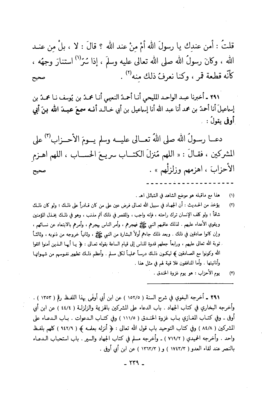 291 - أَخْبَرَنَا عَبْدُ الْوَاحِدِ الْمَلِيحِيُّ أَنَا أَحْمَدُ النُّعَيْمِيُّ أَنَا مُحَمَّدُ بْنُ يُوسُفَ نا مُحَمَّدُ بْنُ إِسْمَاعِيلَ أَنَا أَحْمَدُ بْنُ مُحَمَّدٍ أَنَا عَبْدُ اللَّهِ أَنَا إِسْمَاعِيلُ بْنُ أَبِي خَالِدٍ أَنَّهُ سَمِعَ عَبْدَ اللَّهِ بْنَ أَبِي أَوْفَى يَقُولُ دَعَا رَسُولُ اللَّهِ صَلَّى اللَّهُ تَعَالَى عَلَيْهِ وَسَلَّمَ يَوْمَ الأَحْزَابِ عَلَى الْمُشْرِكِينَ فَقَالَ اللَّهُمَّ مُنَزِّلَ الْكِتَابِ سَرِيعَ الْحِسَابِ اللَّهُمَّ اهْزِمِ الأحزاب اهزمهم وزلزهم. صحيح